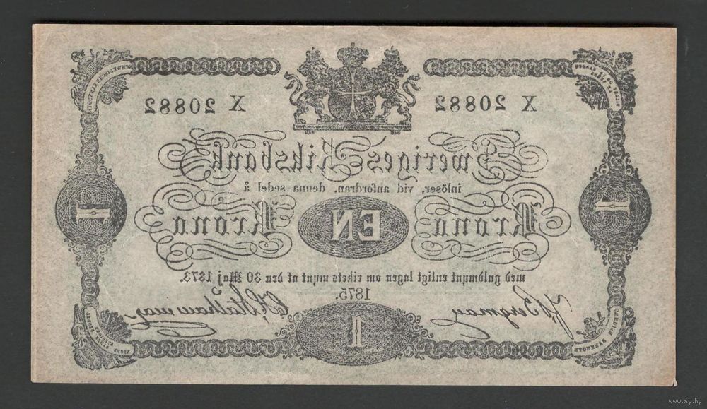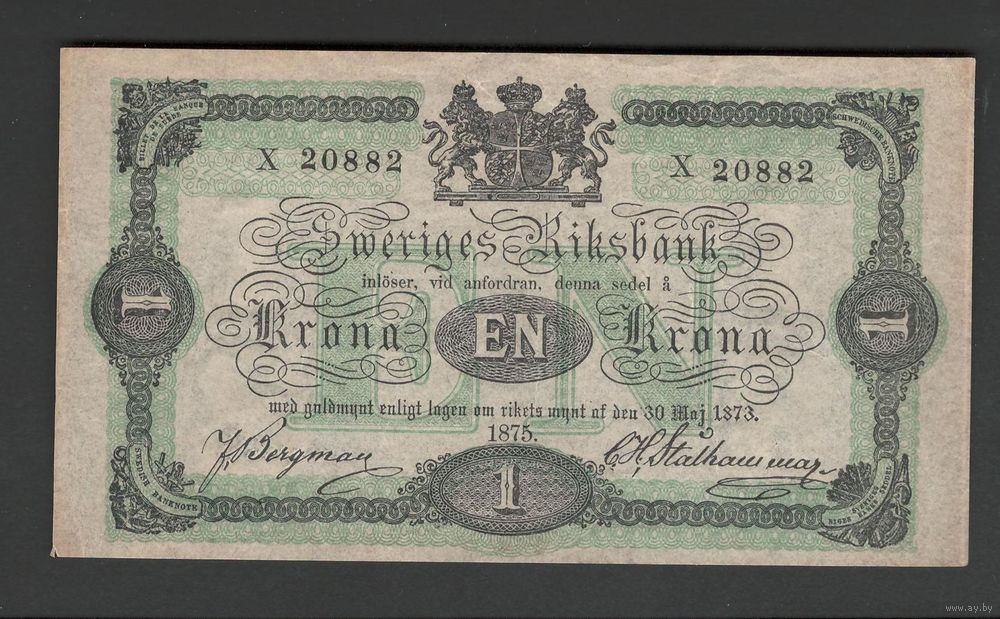 Швеция 1 крона 1875 года. Тип Р-1b. Состояние XF-