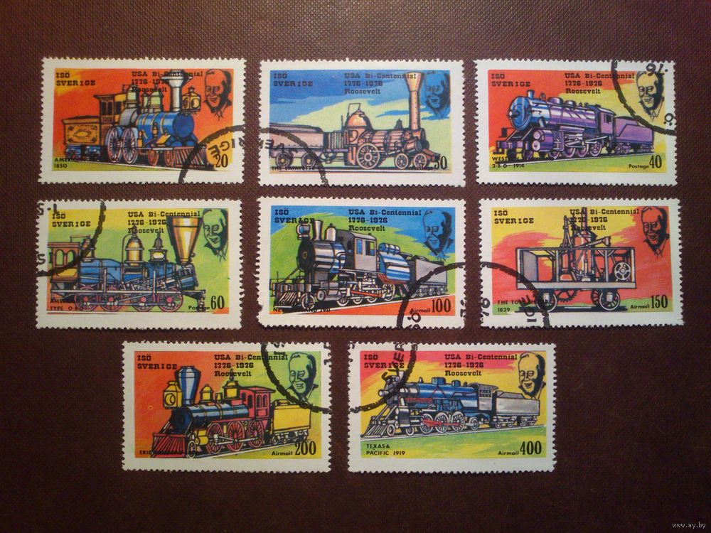 Швеция 1976 г.200-лет независимости США .Локомотивы Двухсотлетия. Гашеная с клеем.Марка номиналом 100 имеет дефект.