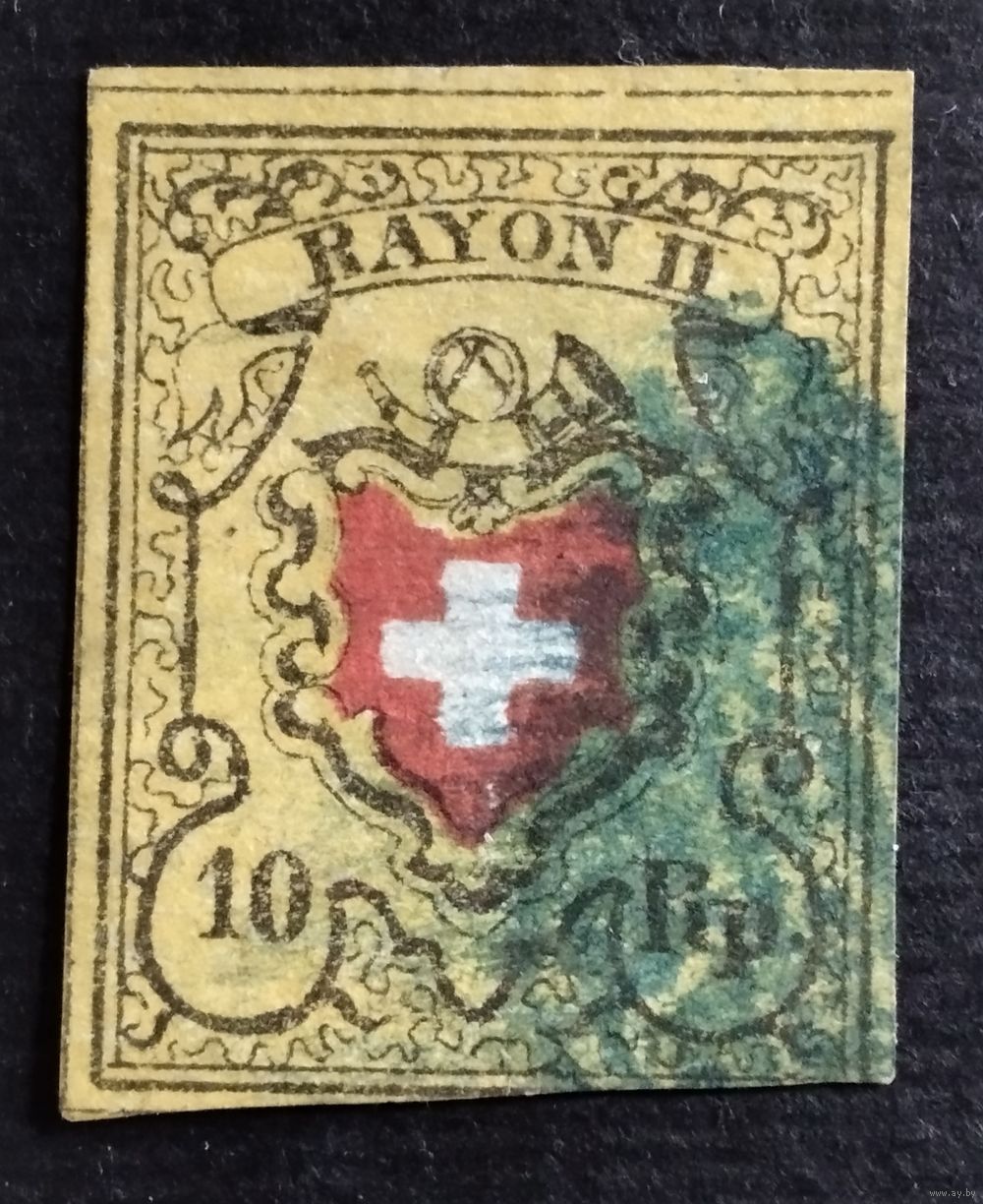 Первые общегосударственные марки Швейцарии, заменившие кантониальные марки. Использовались для оплаты писем,,второго района,, до 48 км. Штемпель ,,синяя розетка,,
