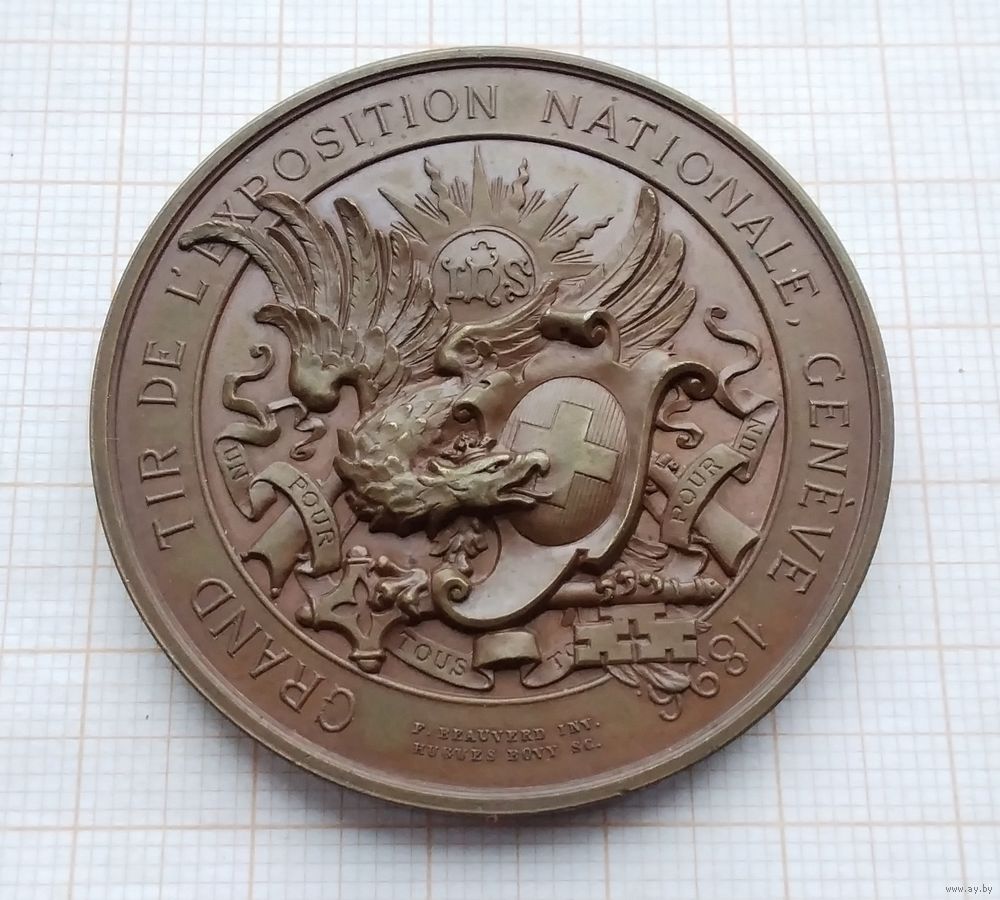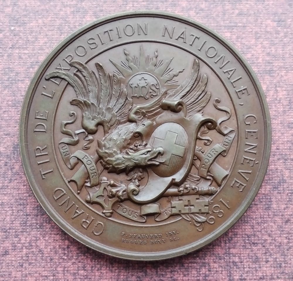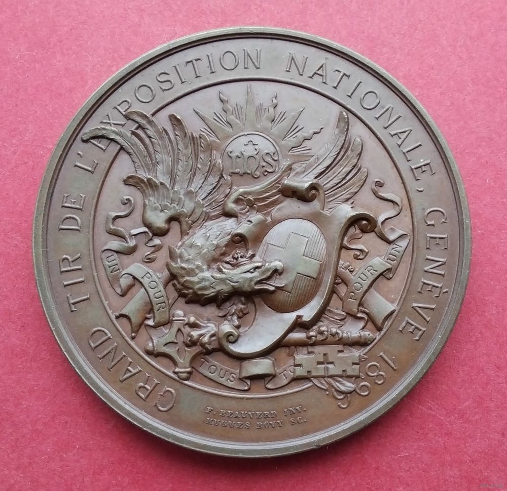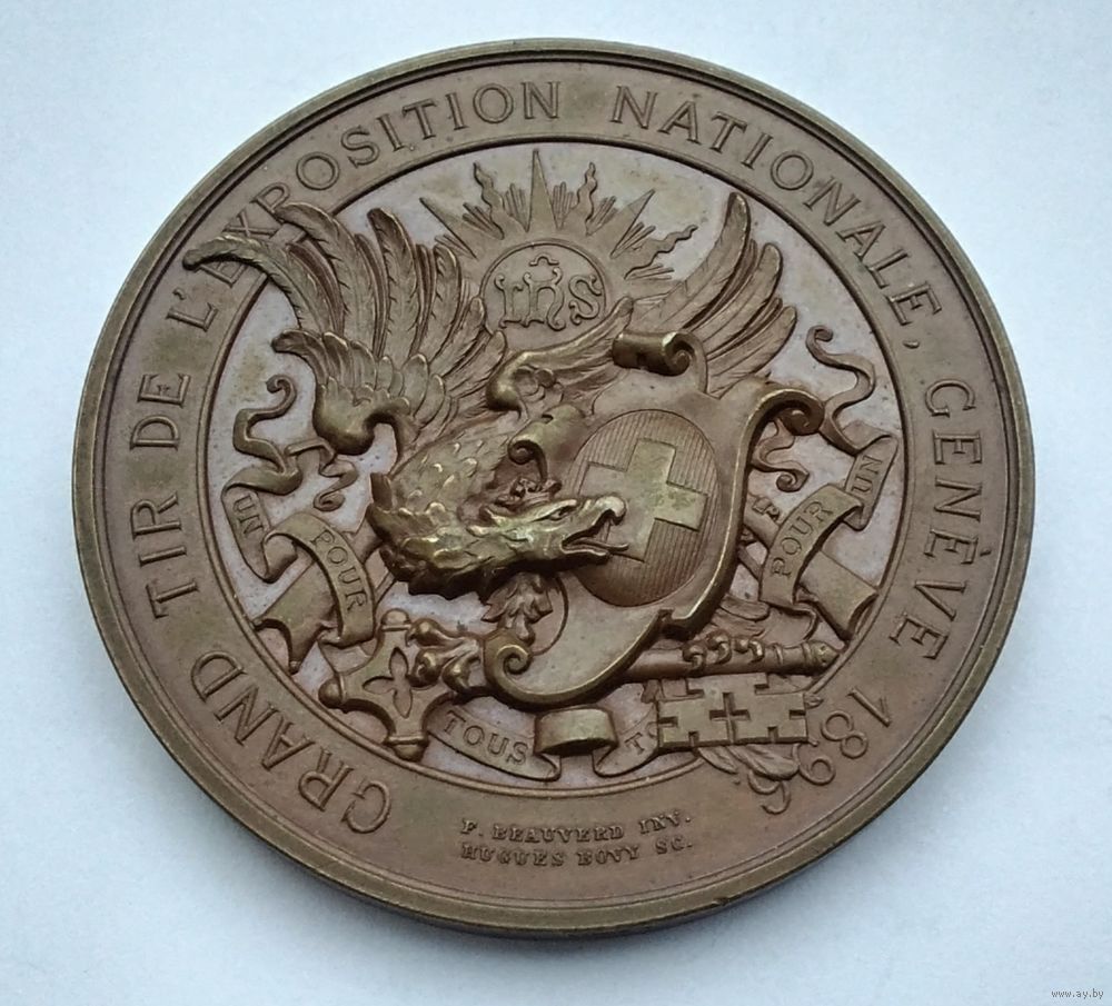 Швейцария. Большой национальный стрелковый фестиваль в Женеве 1896 г. Клеймо на гурте. Медный сплав. Диаметр - 47 мм. Вес - 46 гр. Оригинал.