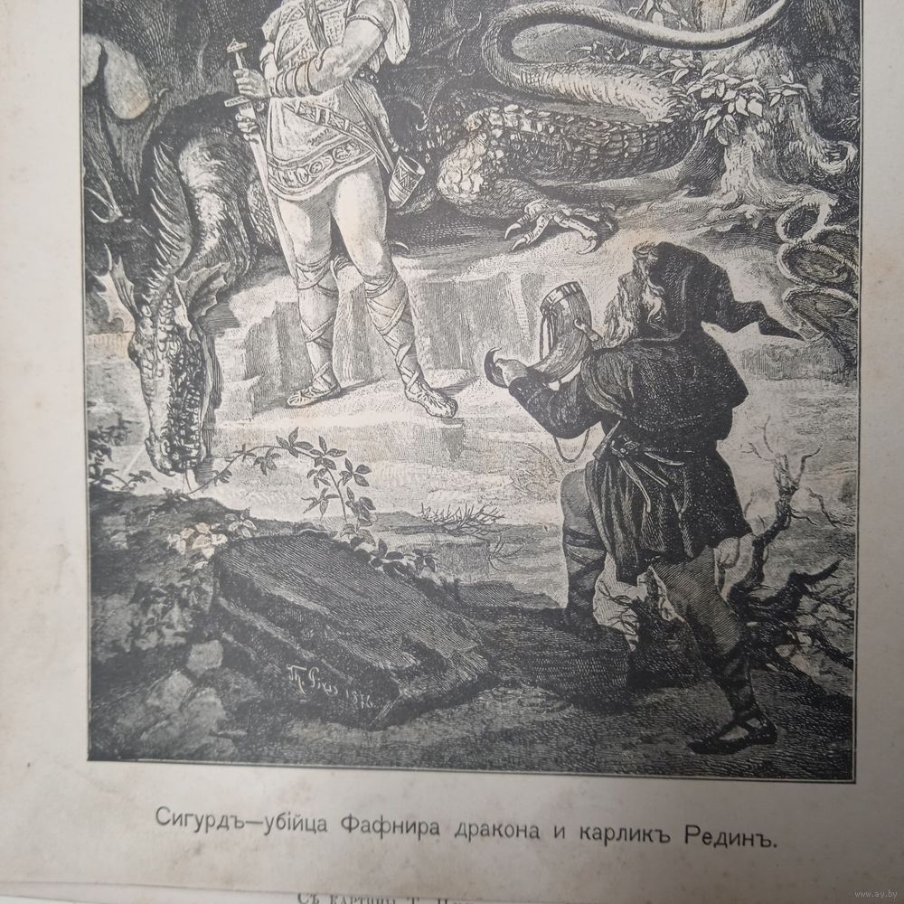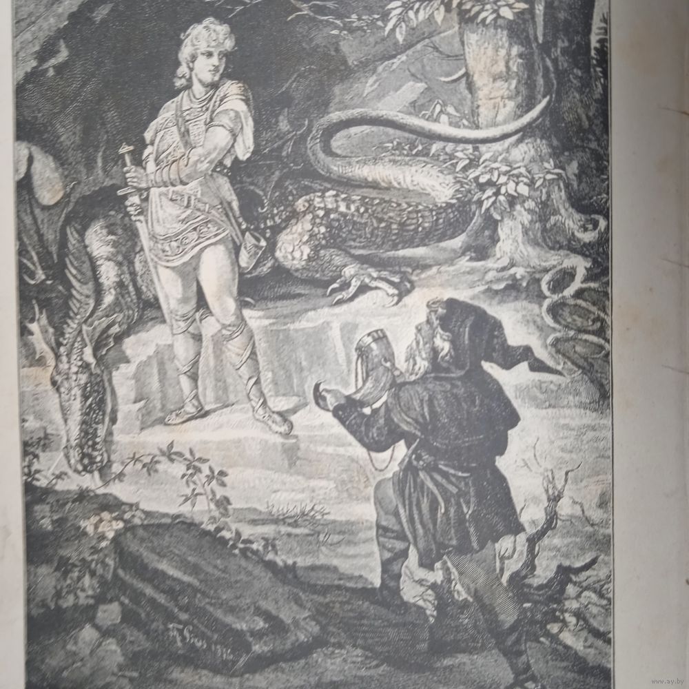 Сигурдъ-убийца дракона и карликъ Рединъ. Гравюра энциклопедическая 19век. 20х14см. СПБ.