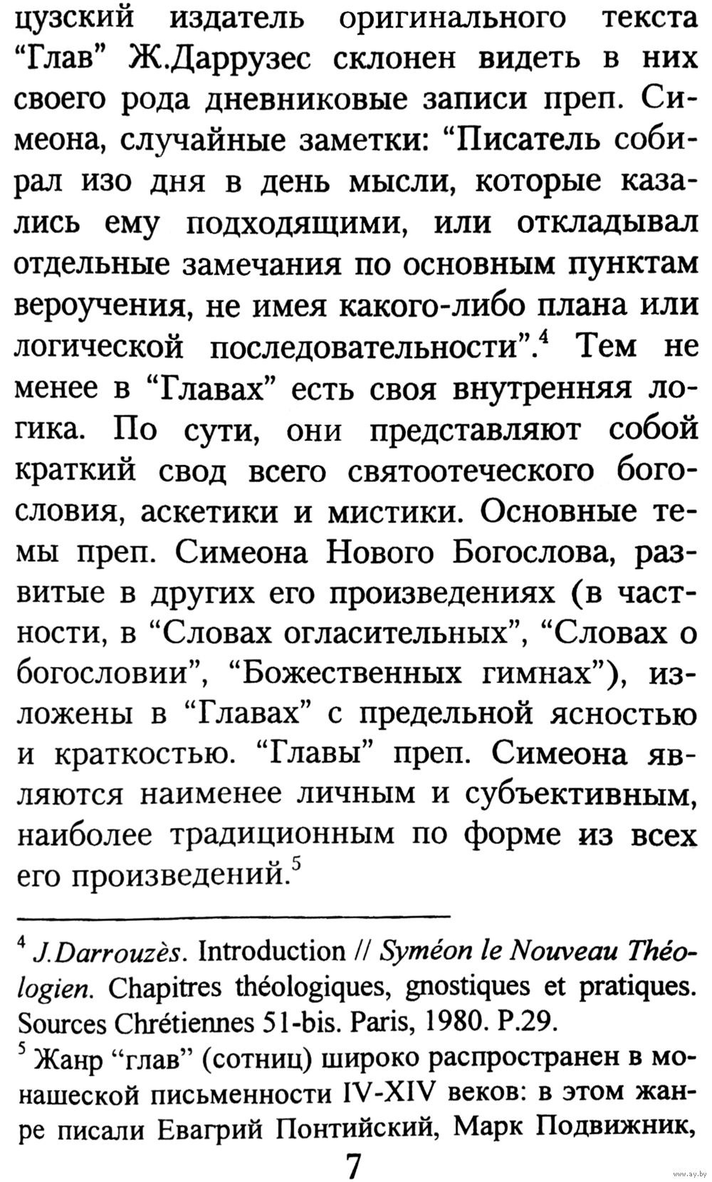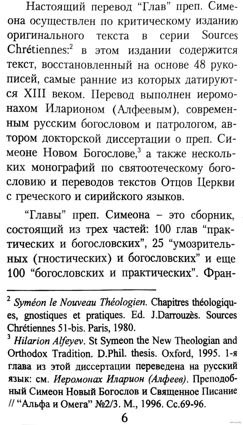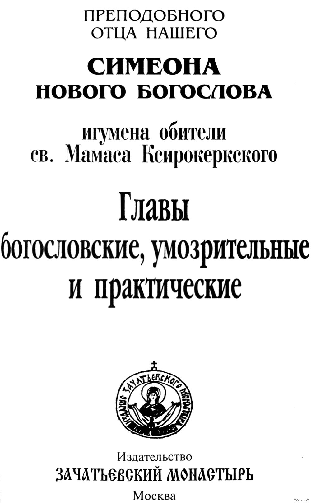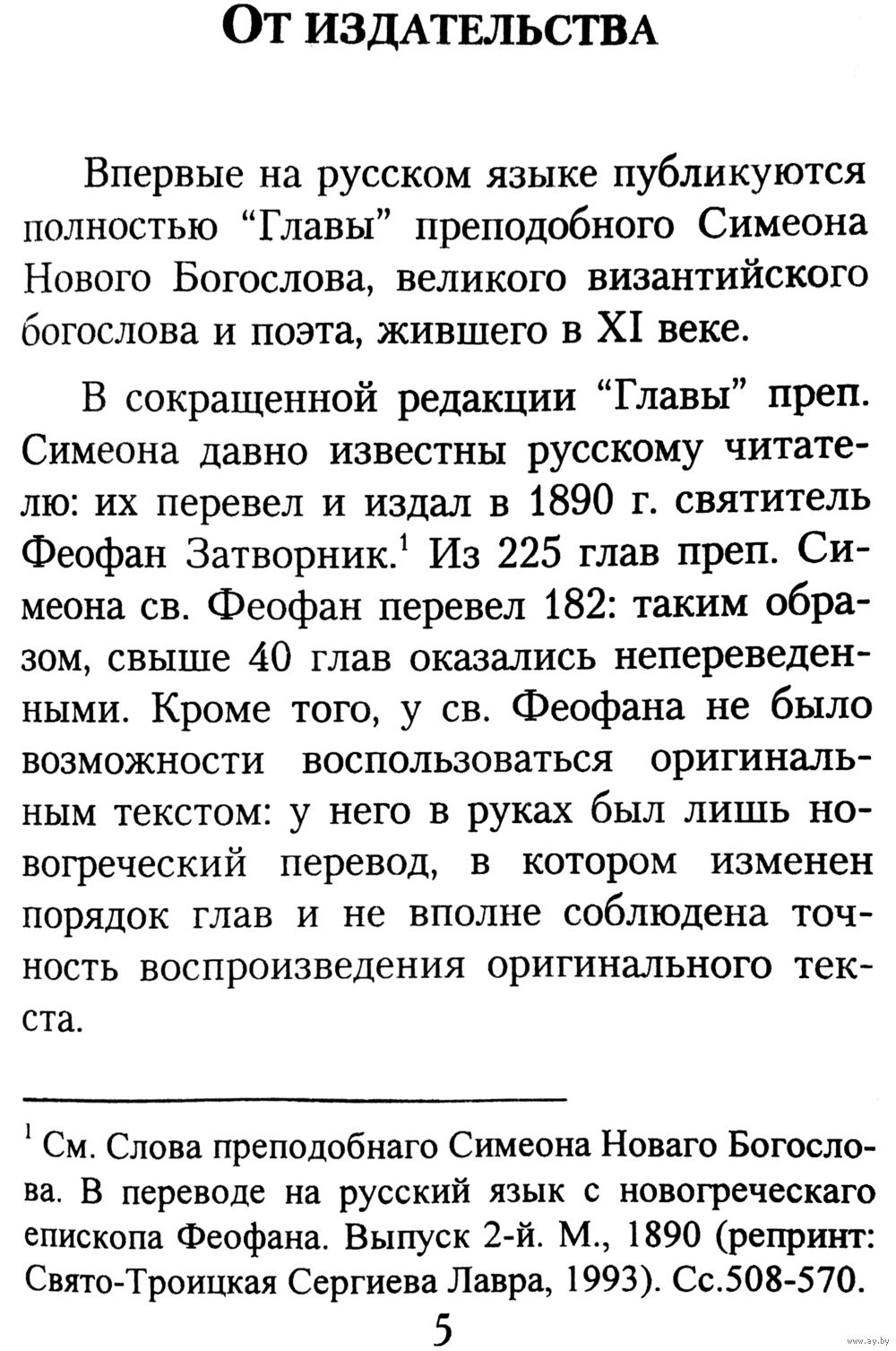 Симеон Новый Богослов "Главы богословские, умозрительные и практические". Впервые на русском языке публикуется полностью и в новом переводе. Сборник представляет собой свод всего святоотеческого богословия и аскетики, важнейшие догматические, нравственные и практические вопросы изложены в "Главах" с предельной ясностью и краткостью. "Главы" Симеона Нового Богослова являются наименее личным и субъективным, наиболее традиционным по форме из всех его произведений. Тем не менее и в них ясно прослеживается новизна его богословской мысли: это особенно относится к 25 главам, помещенным в середине сборника и являющимися его духовной сердцевиной.