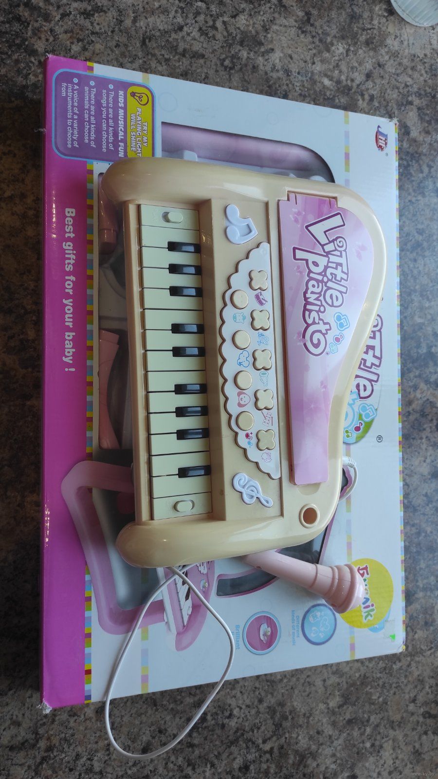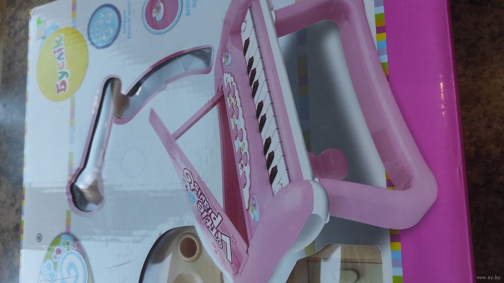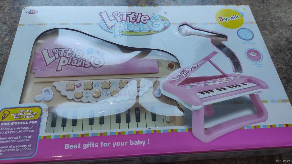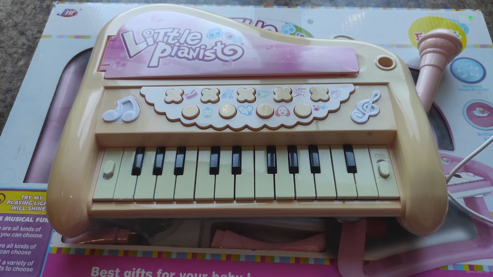 Синтезатор детский в упаковке. В комплекте ножки, микрофон, работает от батареек. очень классный синтезатор, целый, выцвел цвет, ребенок пользовался, любимая игрушка).