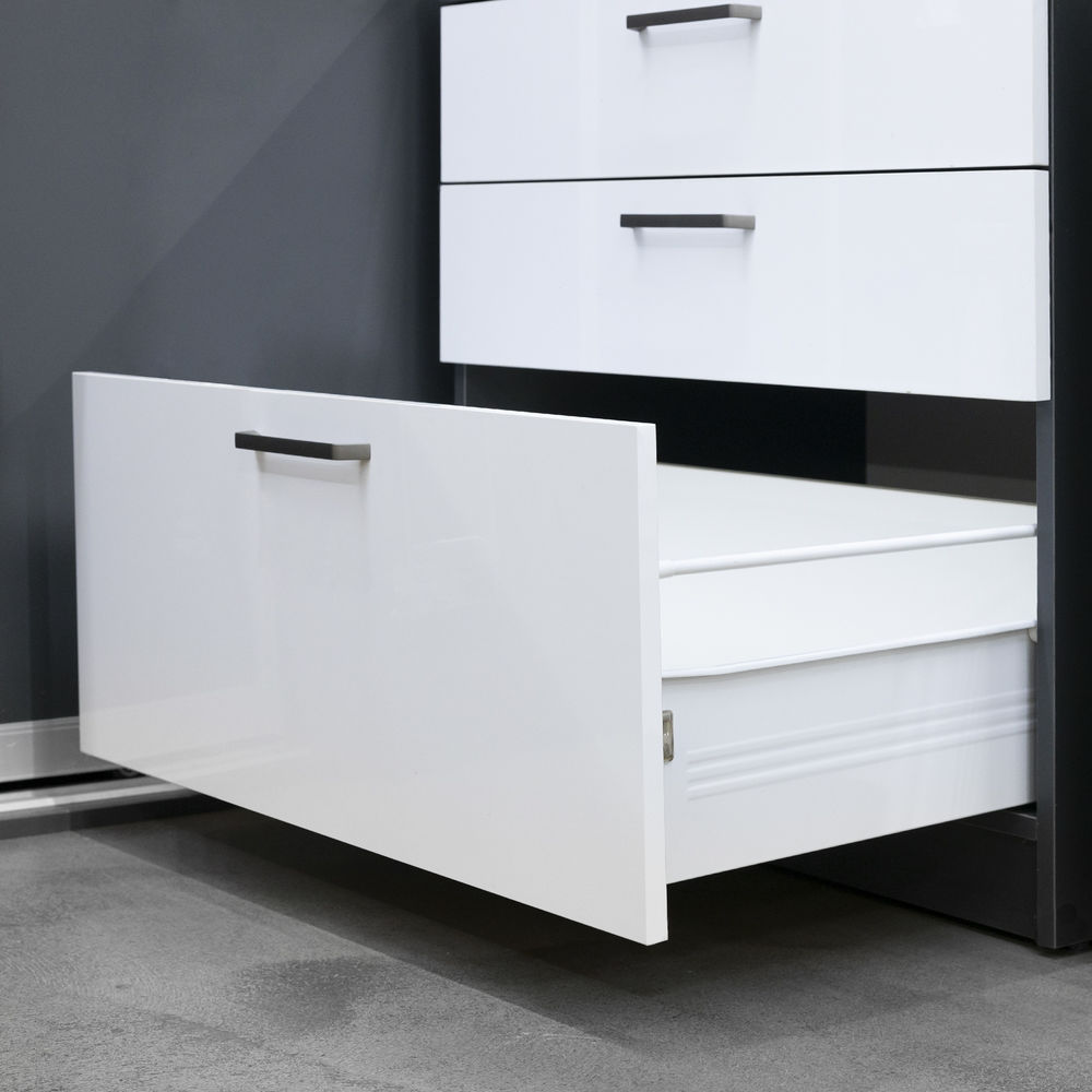 Цельнометаллический выдвижной ящик, построен на базе роликовых направляющих. Надежные и грузостойкие направляющие гарантируют долговечность и эффективную работу в повседневном использовании, обеспечивая плавное и бесшумное выдвижение ящиков.