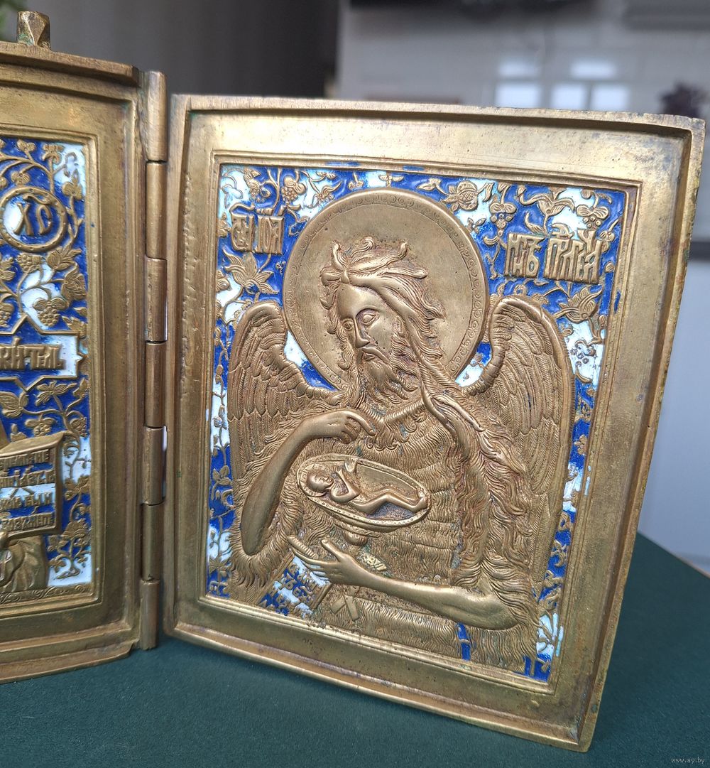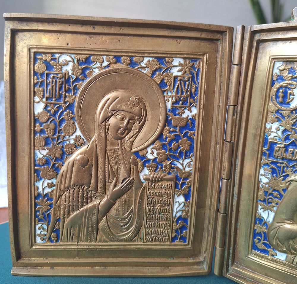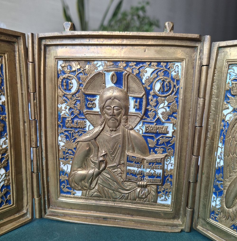 Складень меднолитой, трёхстворчатый, размер: 15,5х39,3 см. Высота 15,5 см - без ушей. Вес складня: 1кг 580 гр. Две эмали. Отличный рельеф, яркая эмаль, геометрия и петли- в порядке. Коллекционный экземпляр.