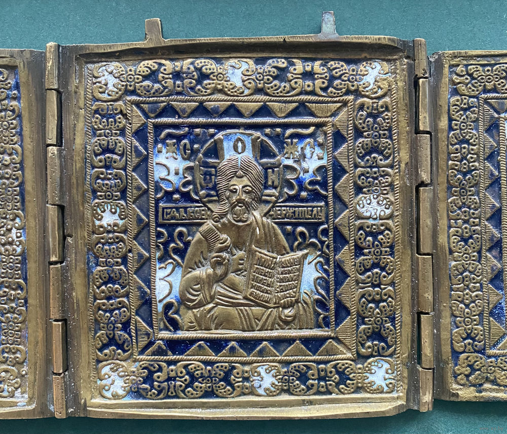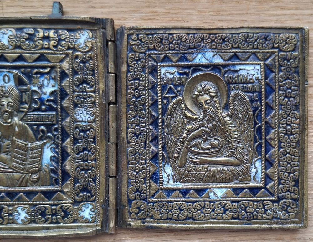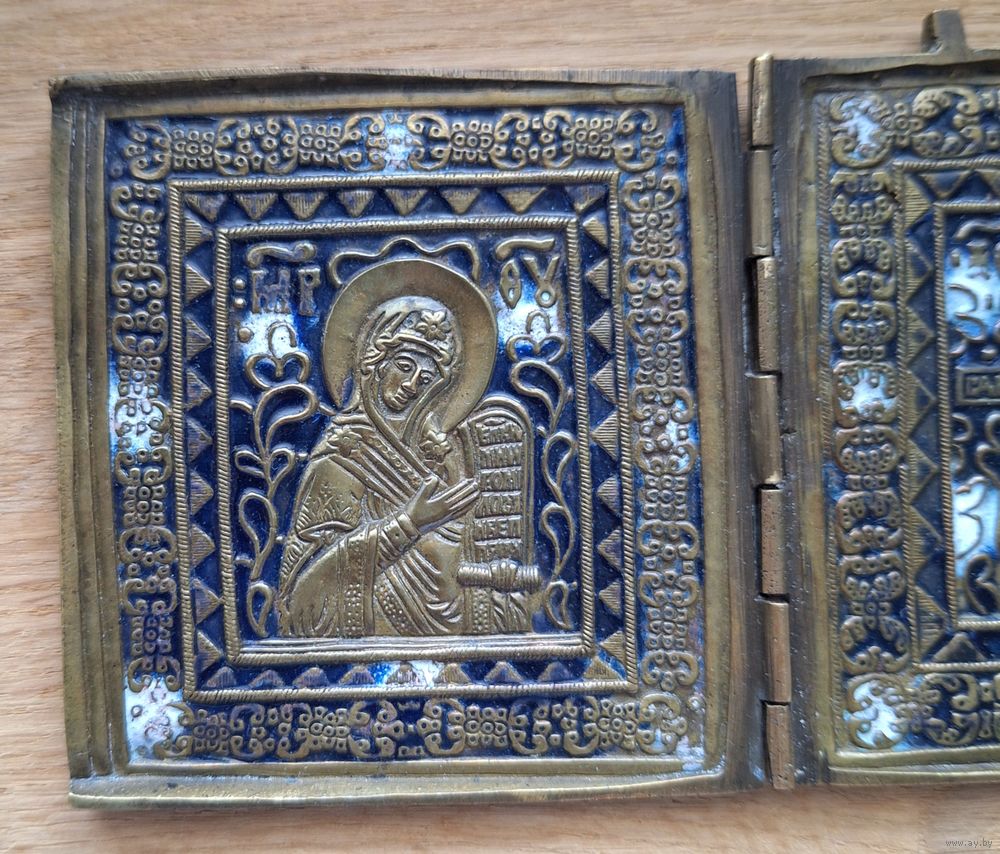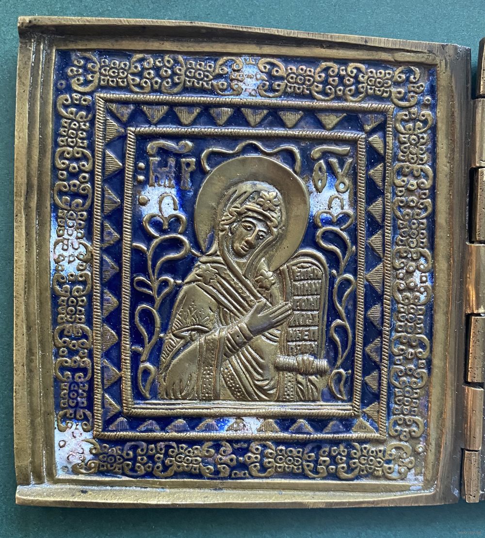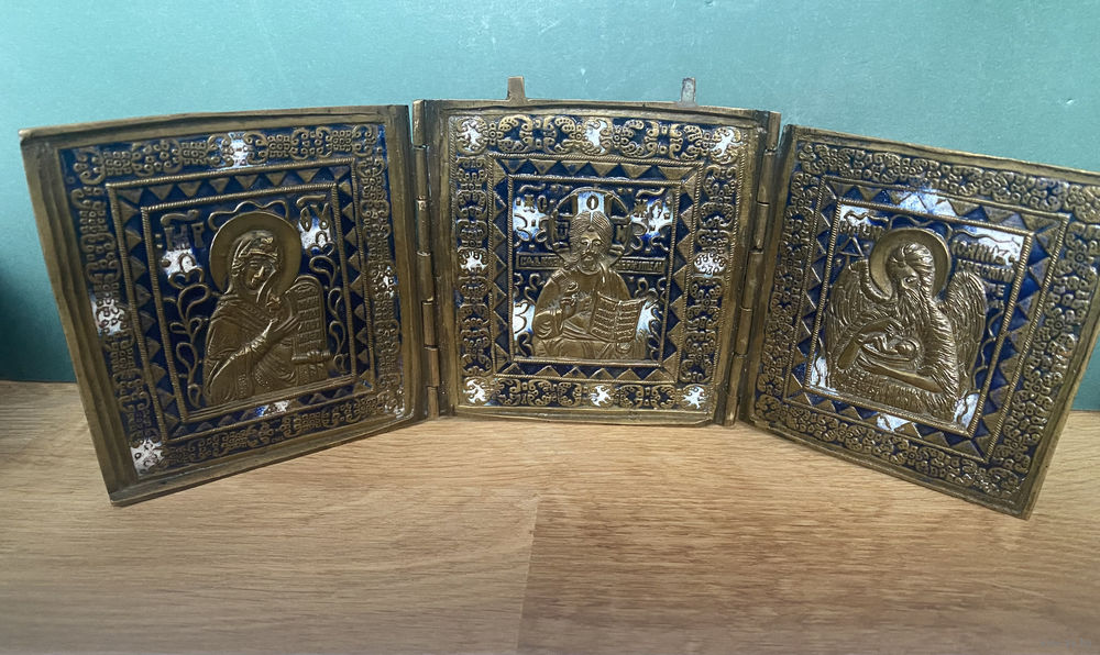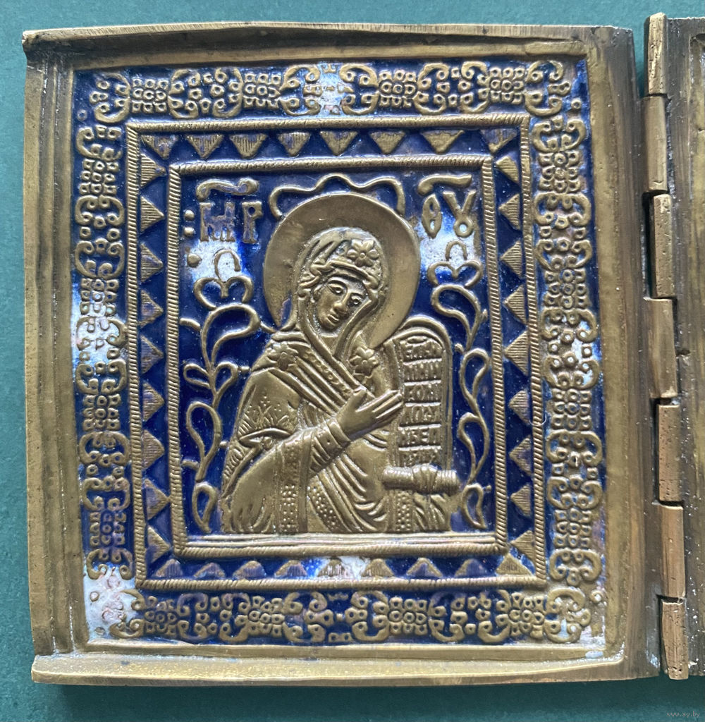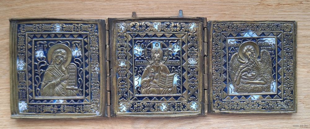 Складень, трёхстворчатый, Деисус, поясной. Две эмали. Размер: 26,6 х 10 см. Отличный рельеф, эмали без утрат, бронза без чистки и царапин. В родной патине. Красивый насыщенный цвет чернильно- синей эмали. Геометрия ровная, петли в порядке.