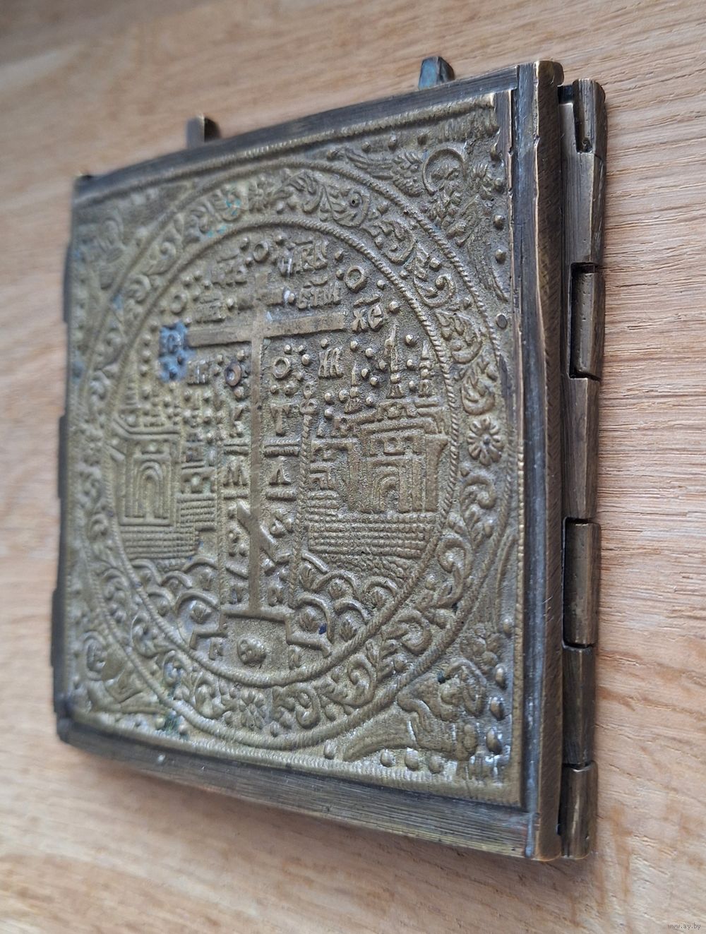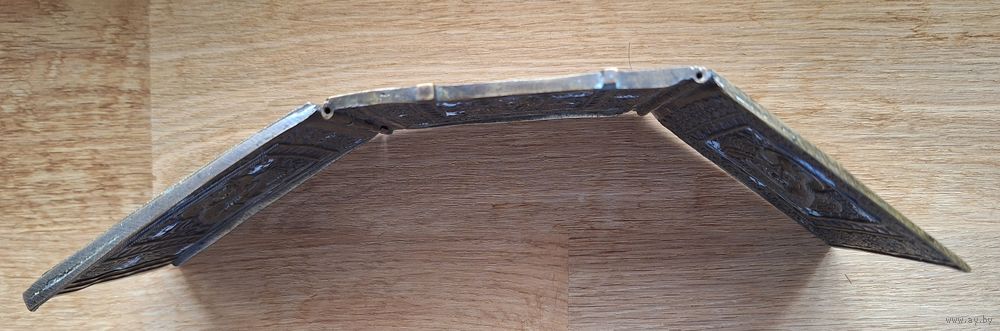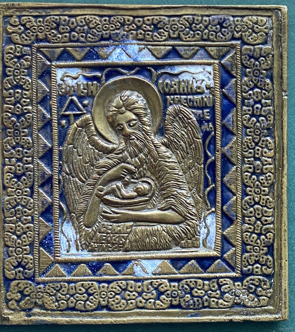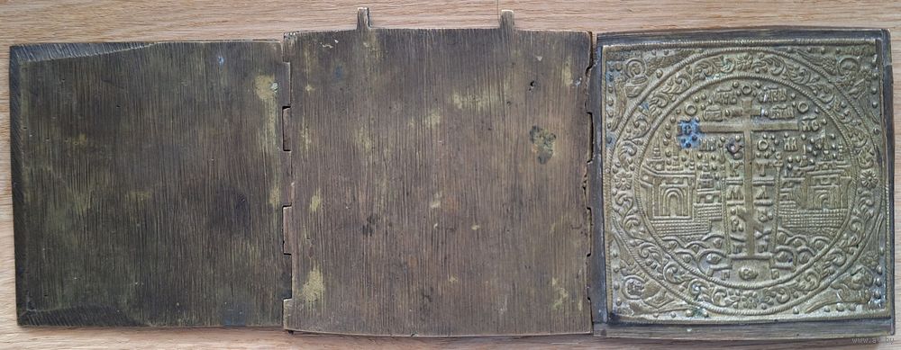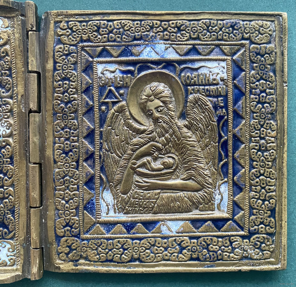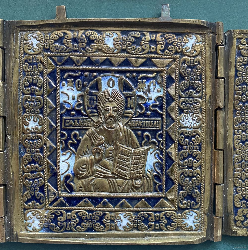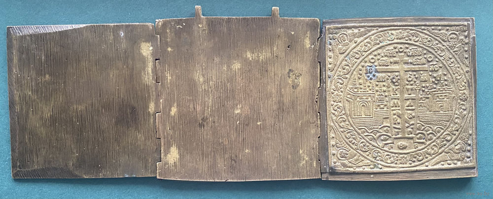 Складень, трёхстворчатый, Деисус, поясной. Две эмали. Размер: 26,6 х 10 см. Отличный рельеф, эмали без утрат, бронза без чистки и царапин. В родной патине. Красивый насыщенный цвет чернильно- синей эмали. Геометрия ровная, петли в порядке.