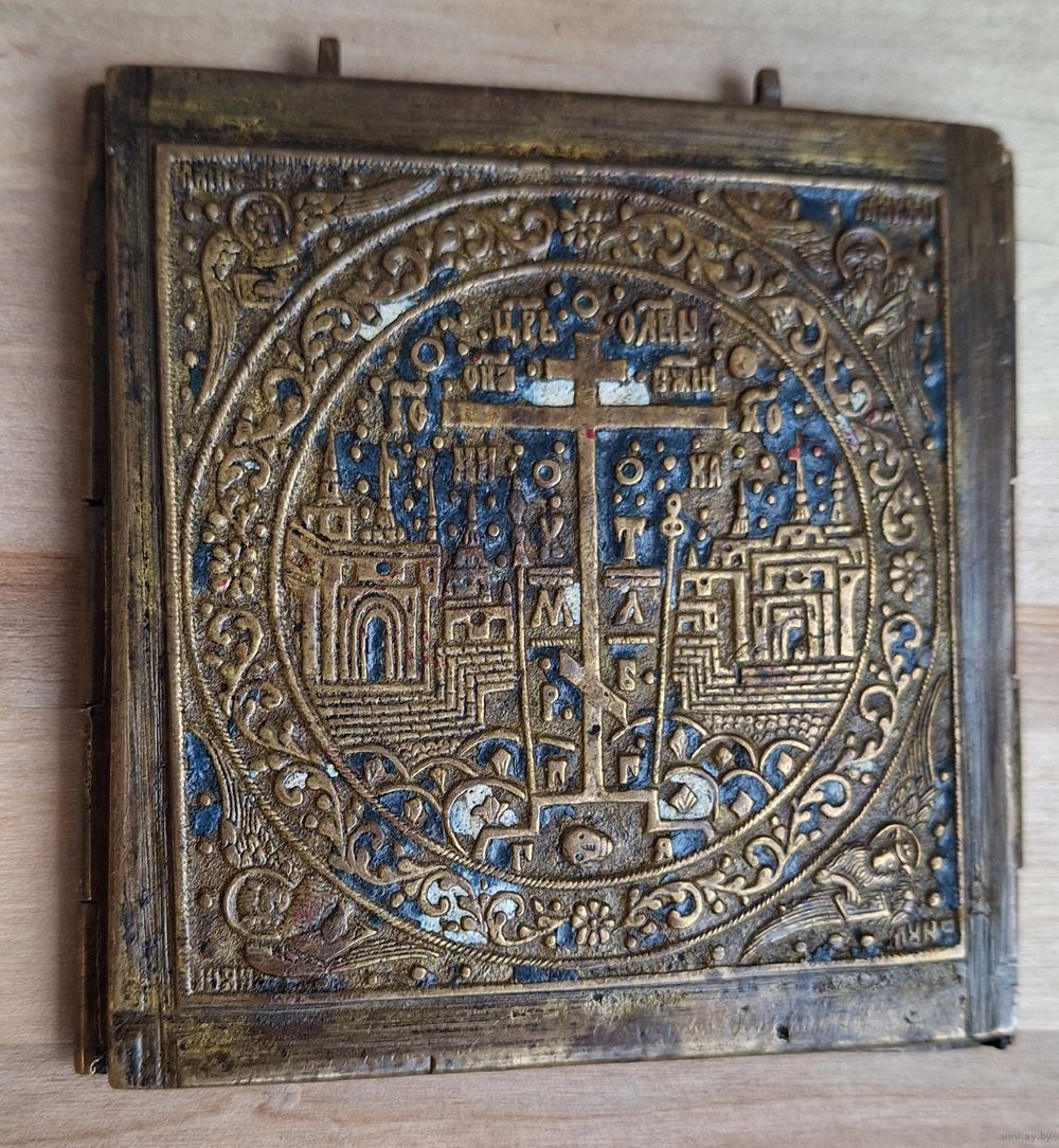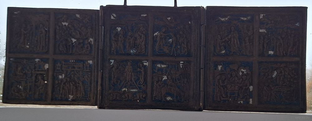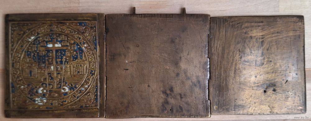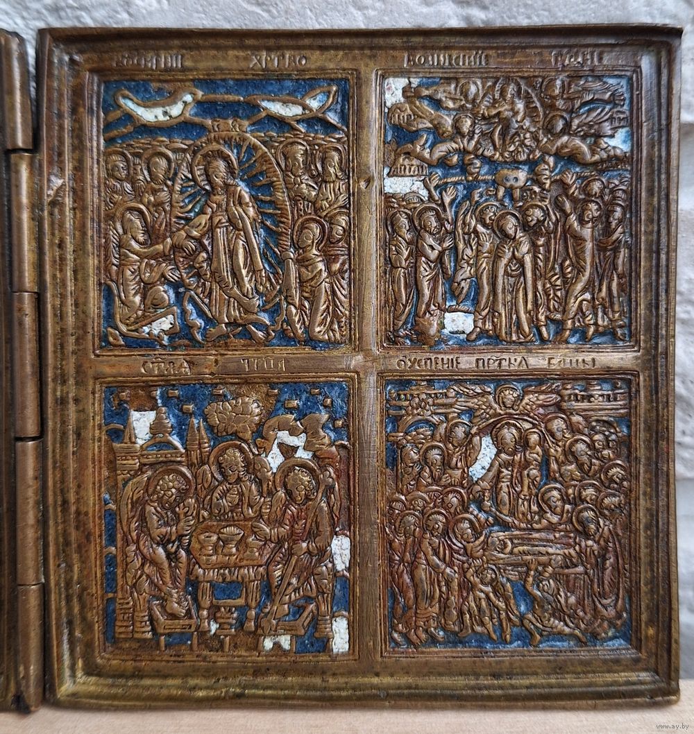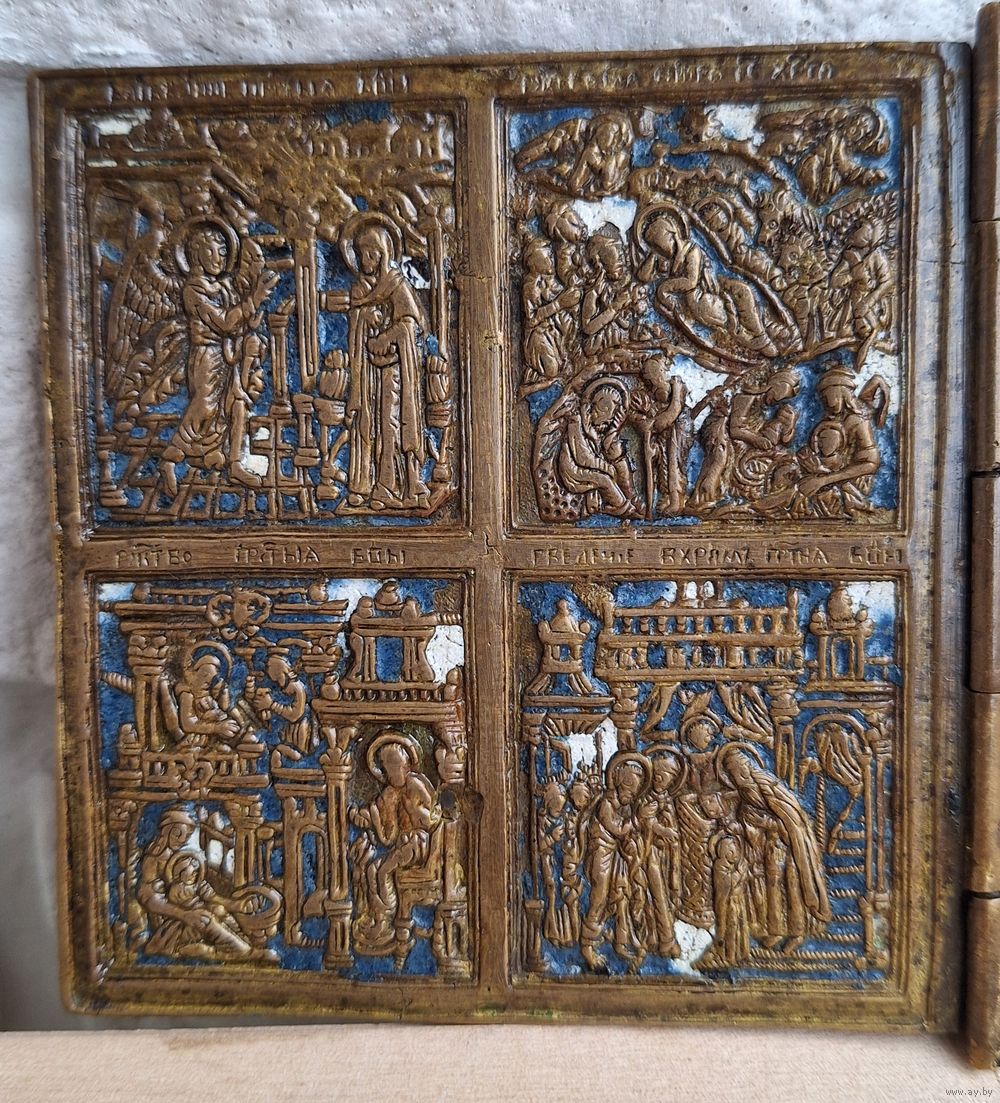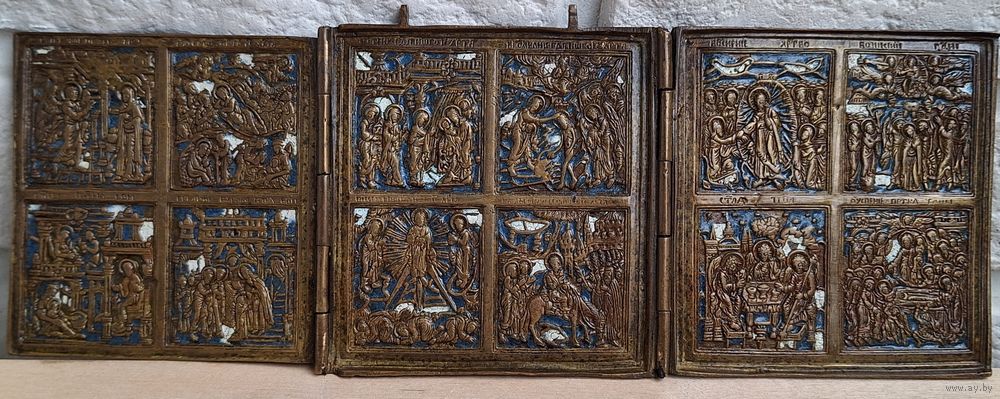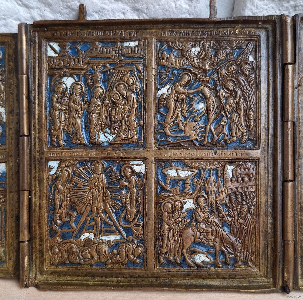 Складень "Двунадесятые Праздники", две эмали, размер: 29,7х10,6 см. Последнее фото, в свету, точки непролива. Петли в порядке, складывается ровно. Хороший рельеф.