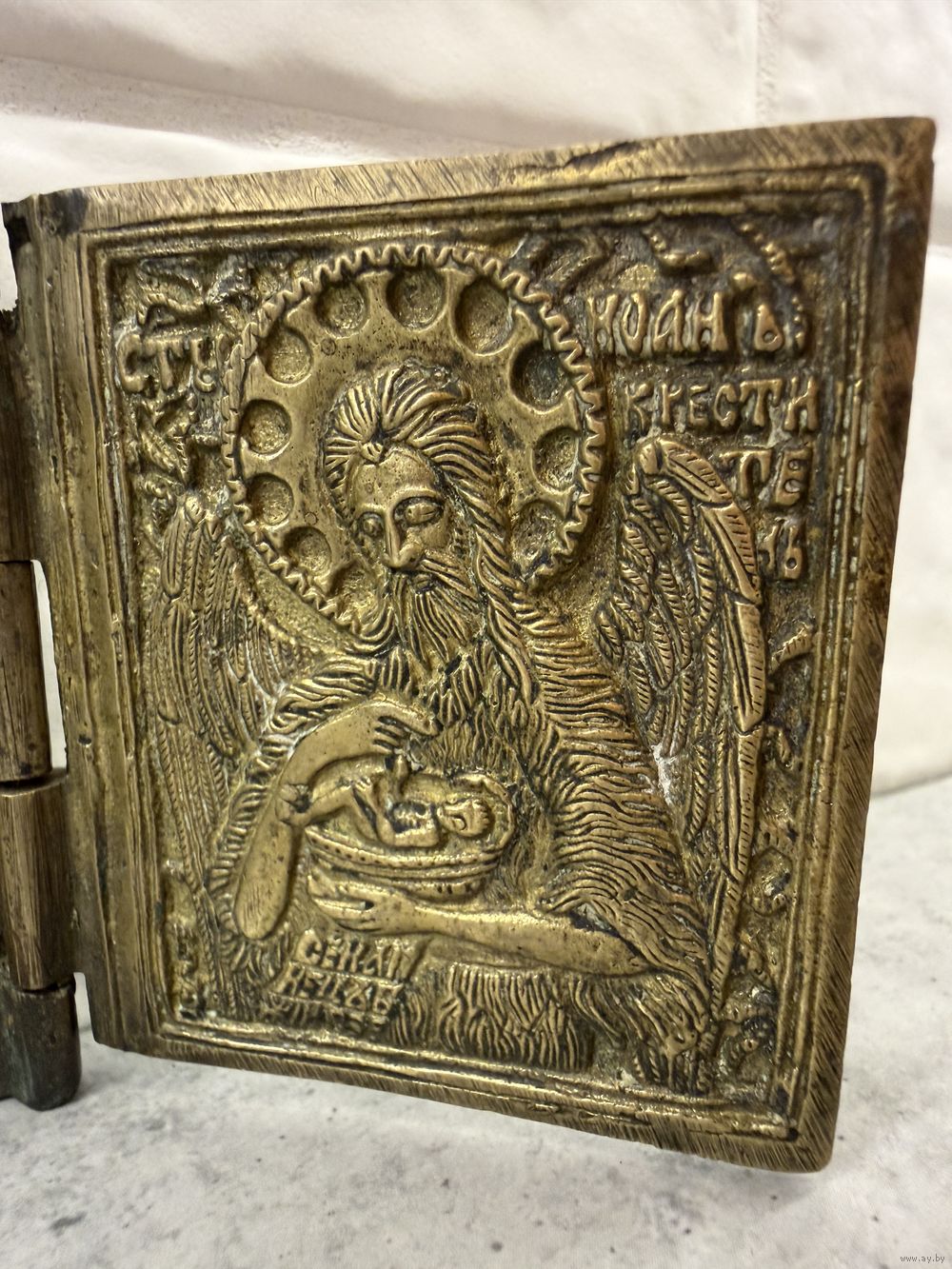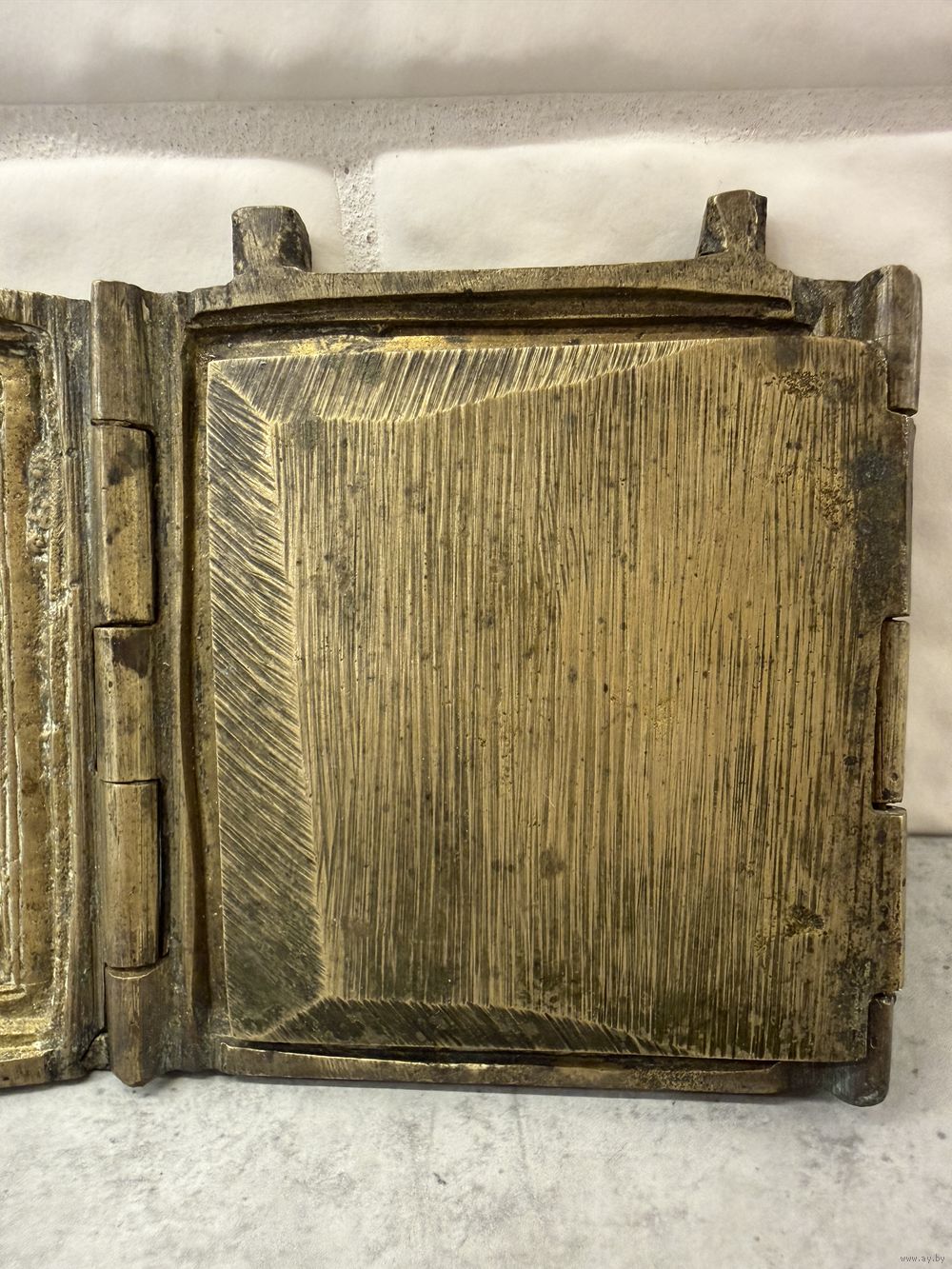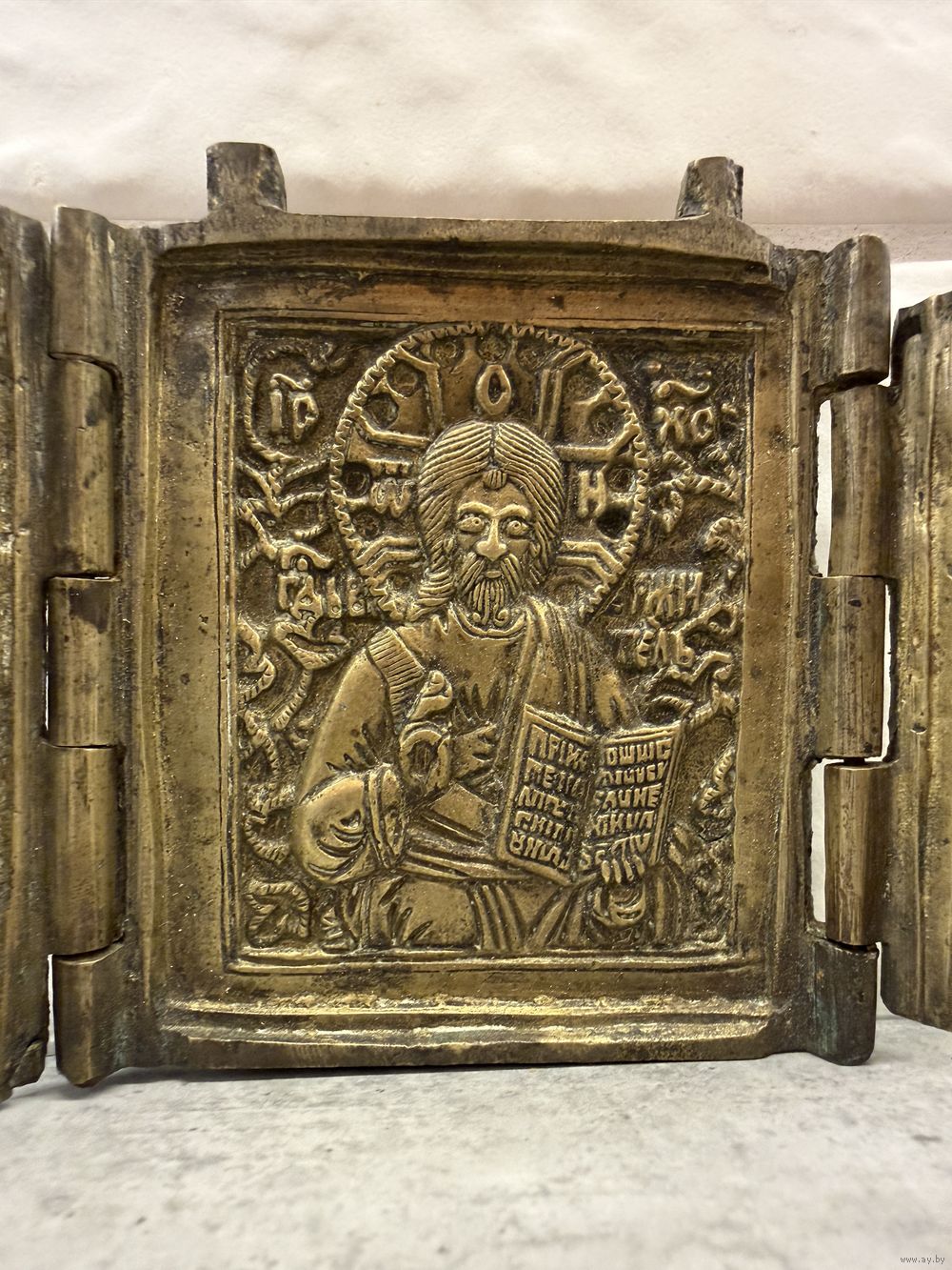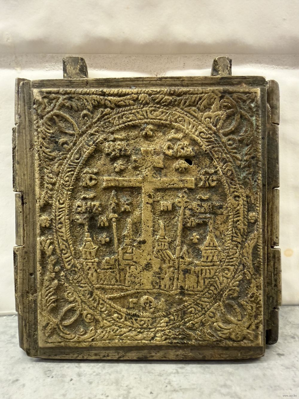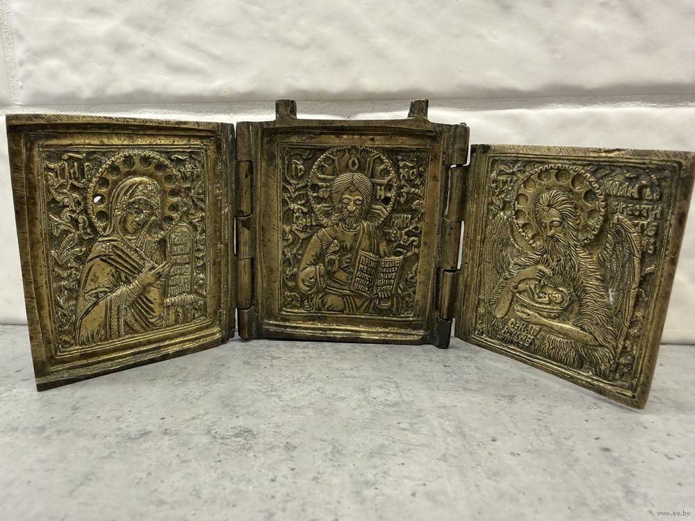 Складень трёхстворчатый "Деисус" Богоматерь, Иисус Христос, Иоанн Предтеча Креститель декорированный изображением Голгофского креста на левой створке Российская империя 1850-1900