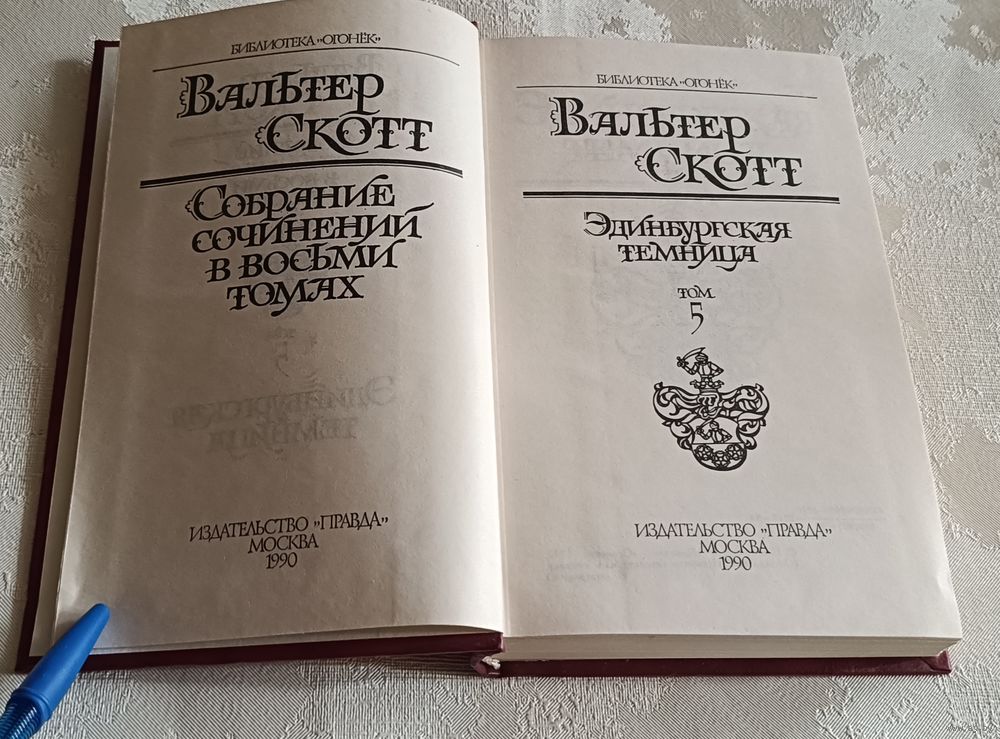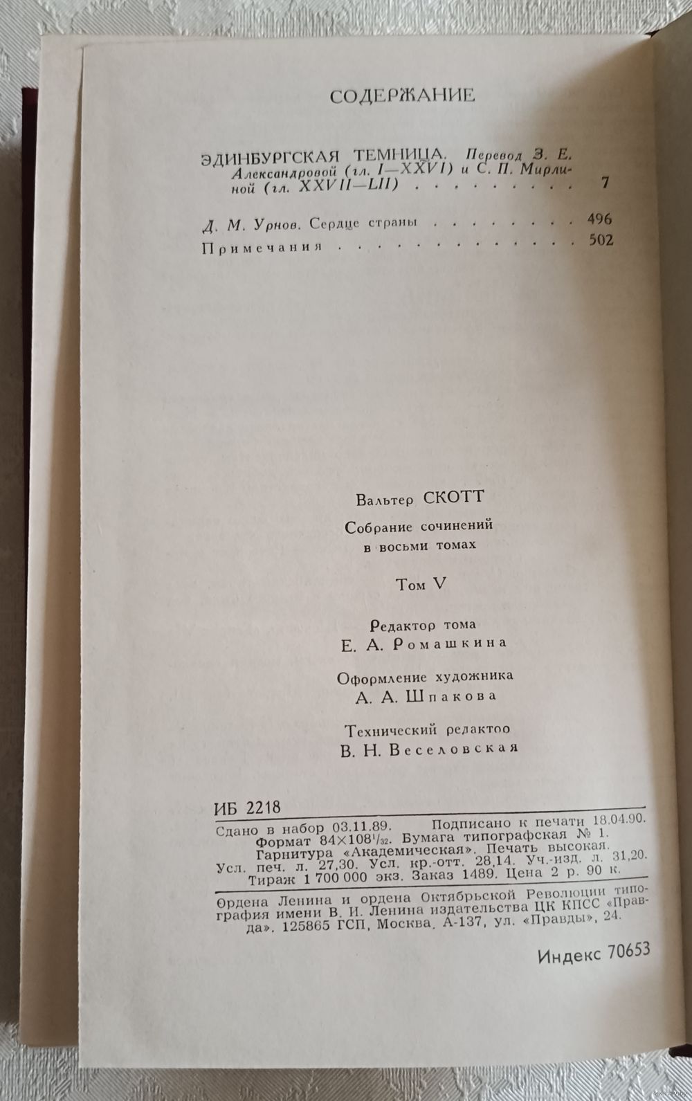 Скотт Вальтер. Собрание сочинений в восьми томах. Том 5. "Эдинбургская темница". Издательство Правда, Москва, 1990, стр. 512. Библиотека огонек. Твердый переплет, обычный формат.