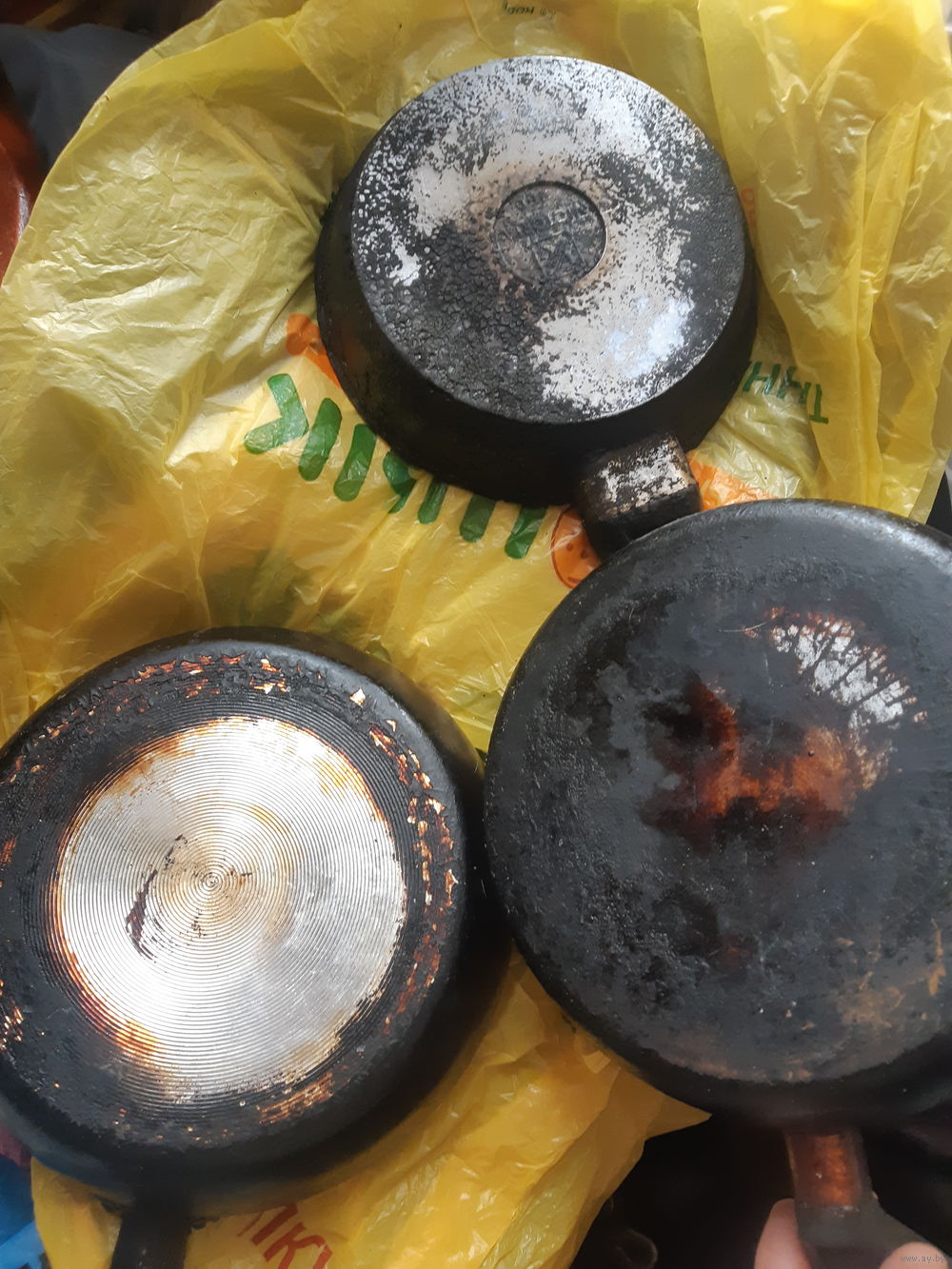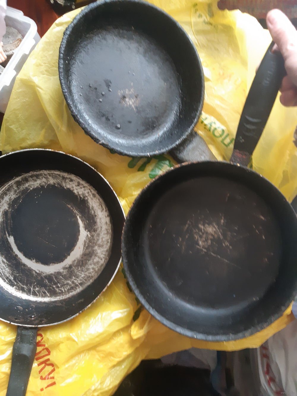 Все хорошие, но нуждаются в чистке. У VICTORIA 21 см диаметр, остальные 23 и 24 см. Все бортики высокие.
