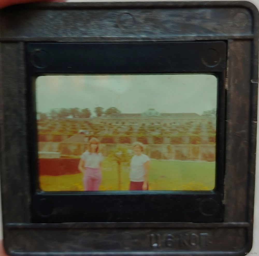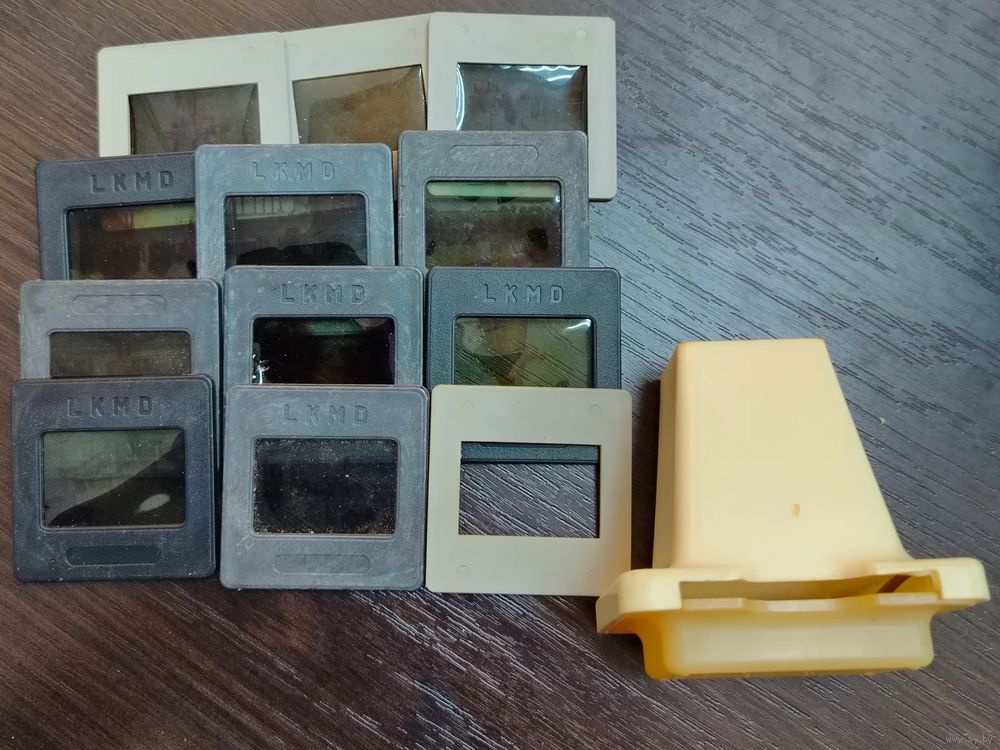 Это ручной оптический прибор для индивидуального просмотра слайдов на просвет. Конструкция позволяет вставлять рамку со слайдом в специальную прорезь и рассматривать изображение через увеличительную линзу, направив прибор на источник света. В одной рамочке нет фотографии, можно вставить свои пленочные фотографии.