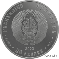 Аверс: вверху по кругу надпись: РЭСПУБЛІКА БЕЛАРУСЬ, в центре – рельефное изображение Государственного герба Республики Беларусь; под ним – год чеканки и номинал 20 РУБЛЁЎ, слева – проба сплава, справа – масса монеты.
