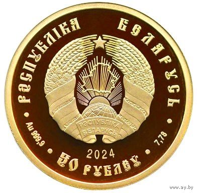 Аверс: вверху по кругу надпись: РЭСПУБЛІКА БЕЛАРУСЬ, в центре – рельефное изображение Государственного герба Республики Беларусь; под ним – год чеканки и номинал 50 РУБЛЁЎ, слева – проба сплава, справа – масса монеты.