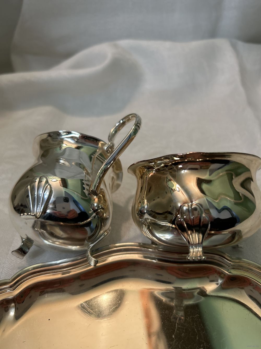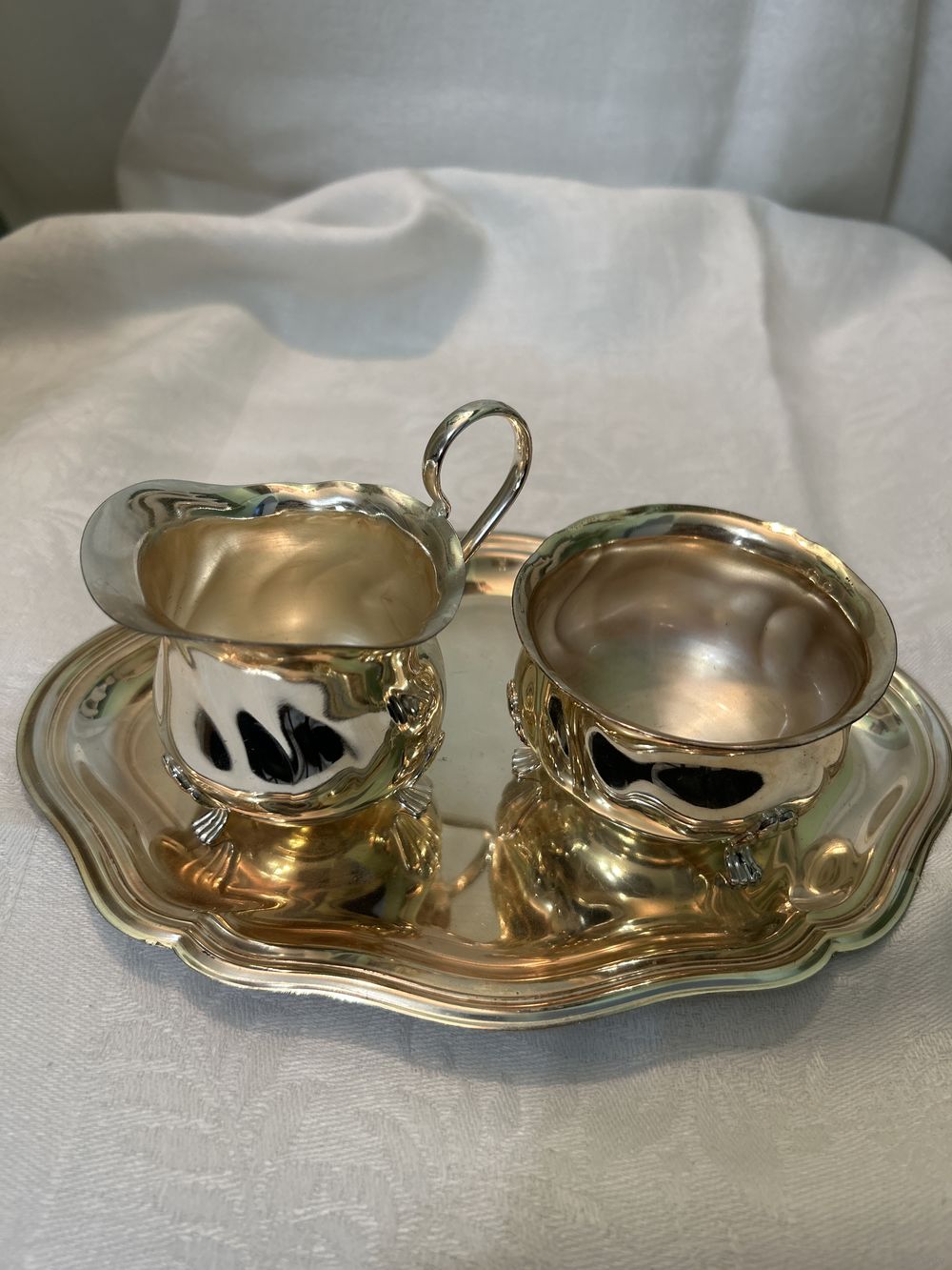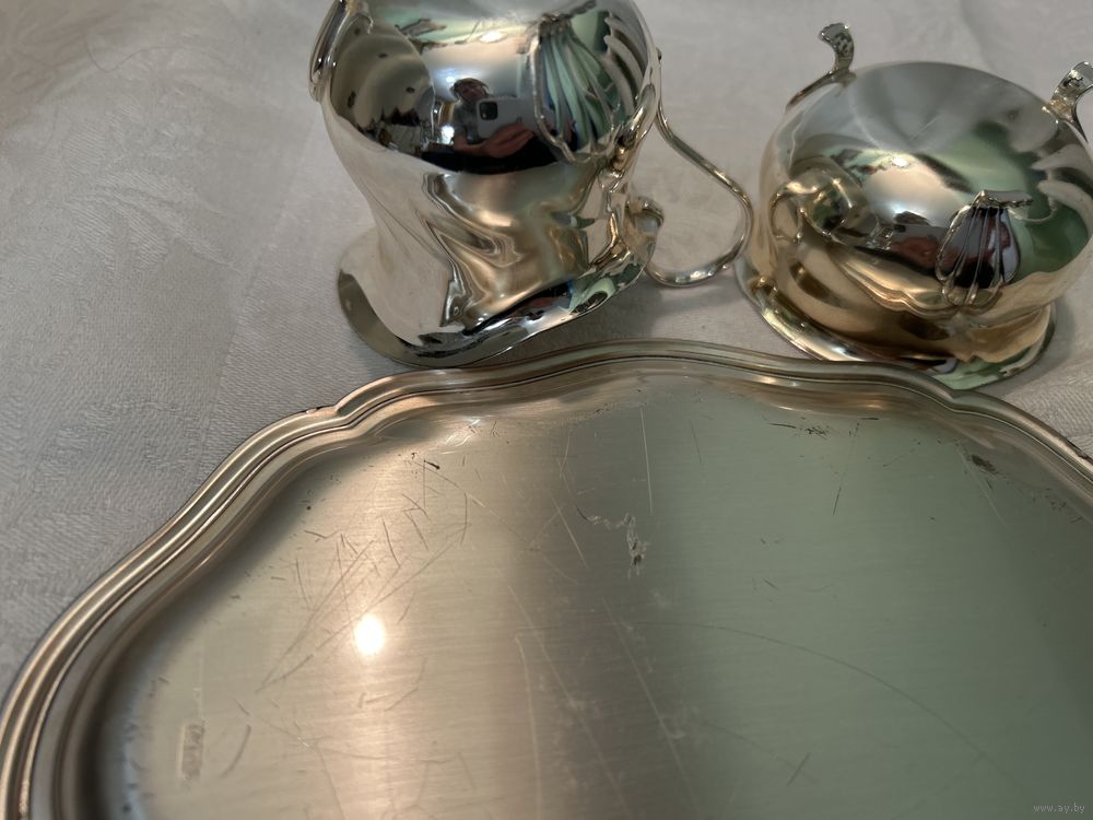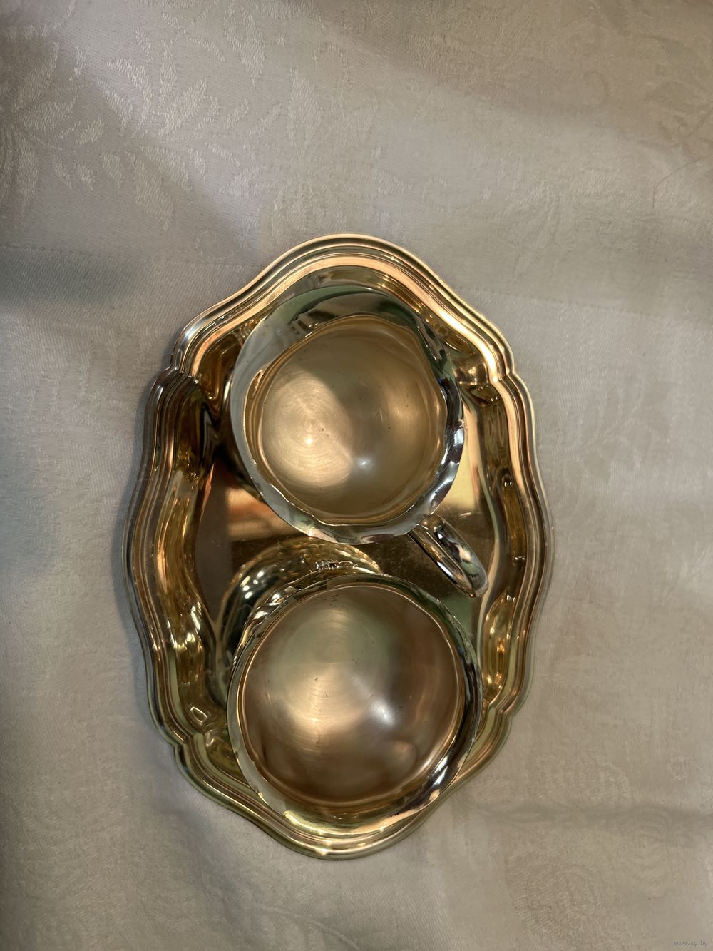 3- х предметный наборчик, длина подноса 21 см, диаметр сливочника и вазочки 6,5- 7,5 см. Италия.