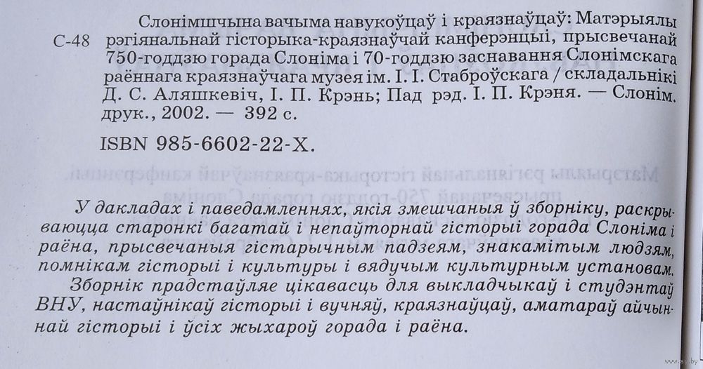 Слонімшчына вачыма навукоўцаў і краязнаўцаў: матэрыялы рэгіянальнай гісторыка-краязнаўчай канферэнцыі, прысвечанай 750-годдзю горада Слоніма і 70-годдзю заснавання Слонімскага раённага краязнаўчага музея імя І. І. Стаброўскага. Складальнікі: Д. С. Аляшкевіч, І. П. Крэнь. Слонім : Слонімская друкарня, 2002 г. 391 с. Мяккая вокладка.
