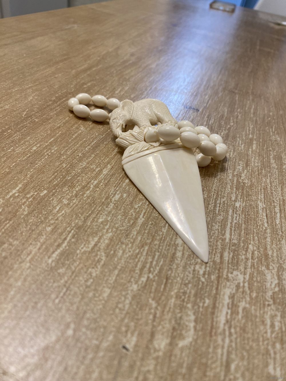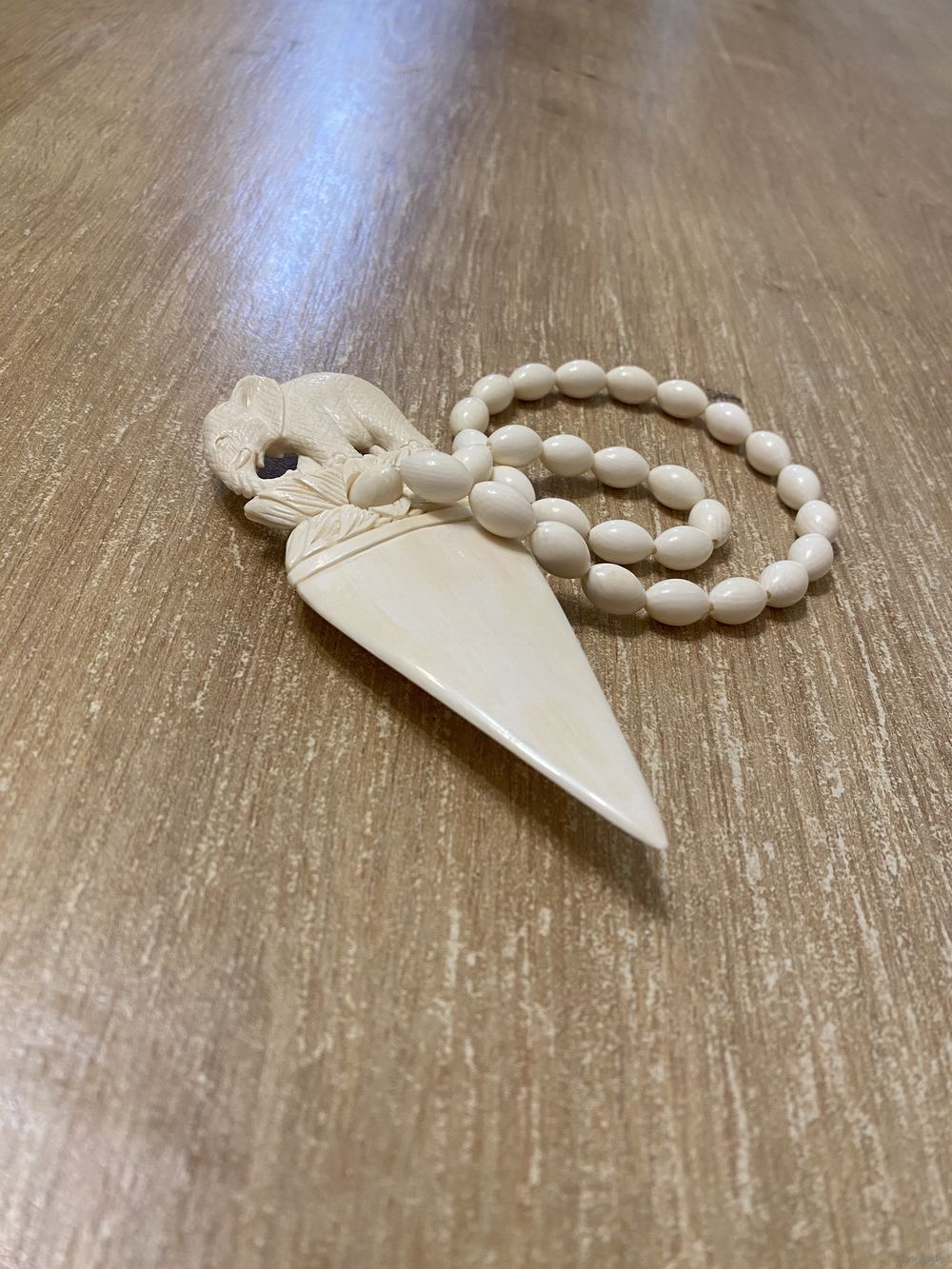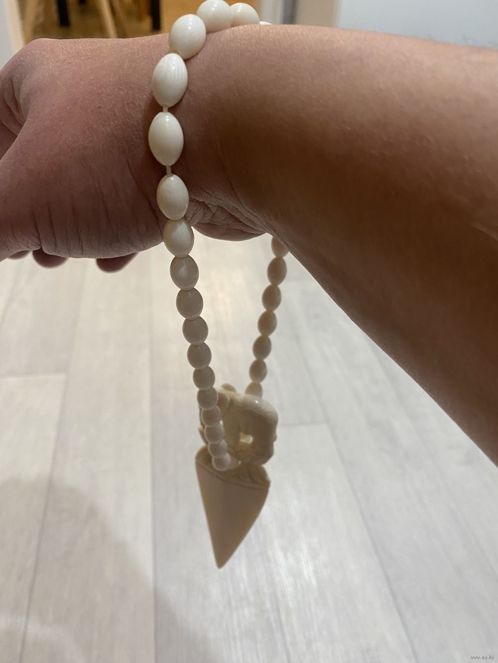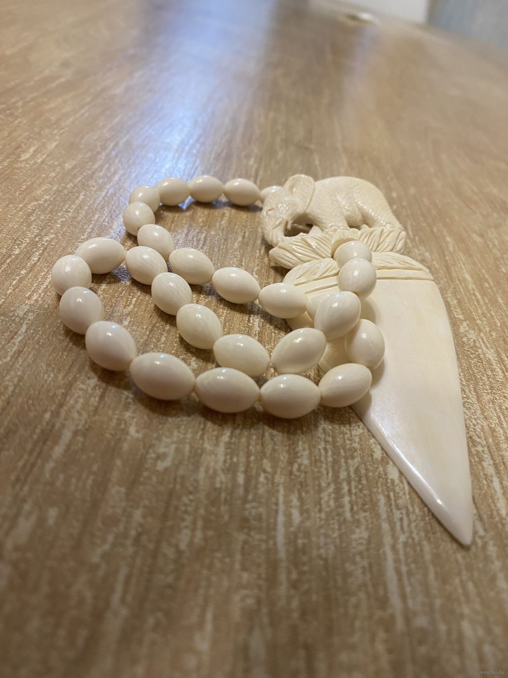 Чётки ручной работы. Сделаны из слоновой кости. Подвес с двухсторонней резьбой в виде ножа для бумаги, 33 бусины 8,5х12,5мм