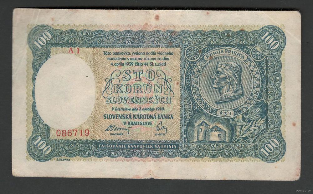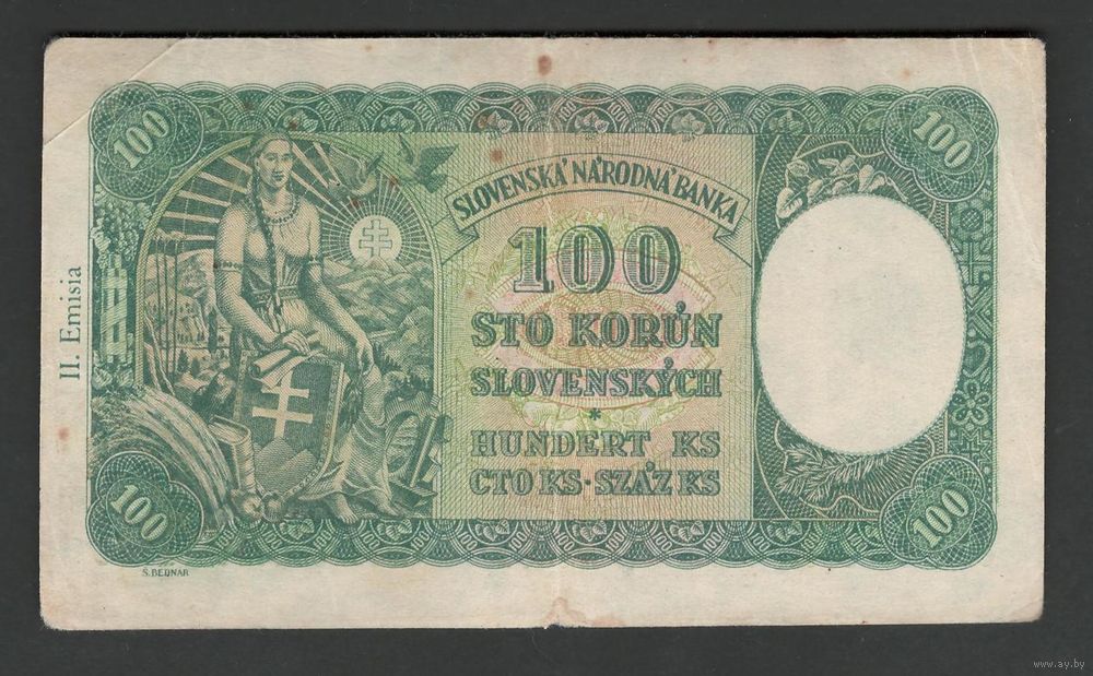Словакия 100 крон 1940 года. Без перфорации. Второй выпуск. Тип Р-11. Состояние VF+