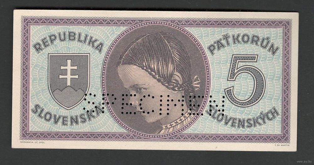 Словакия 5 крон 1945 года. Перфорация. Тип Р-8. Состояние UNC