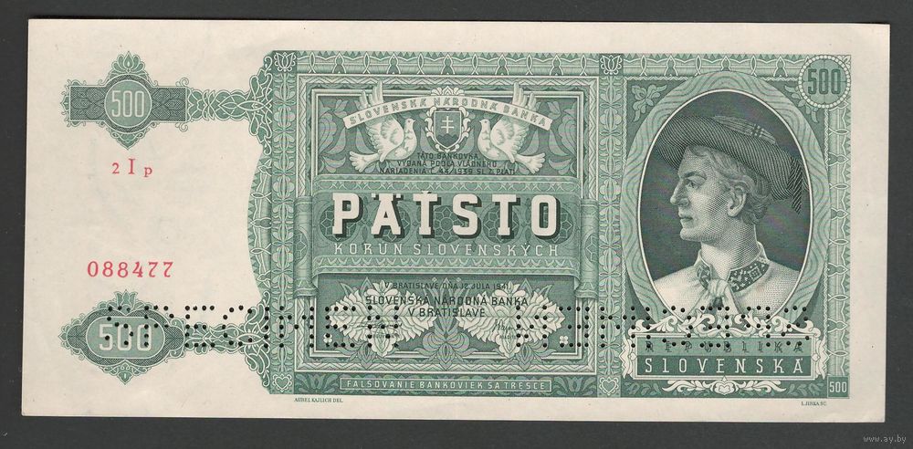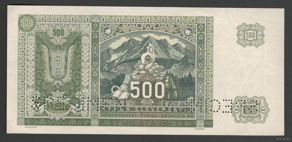 Словакия 500 крон 1941 года. Перфорация. Тип Р-12. Состояние aUNC