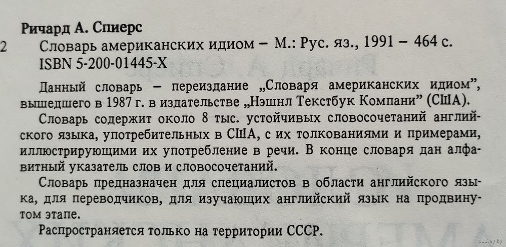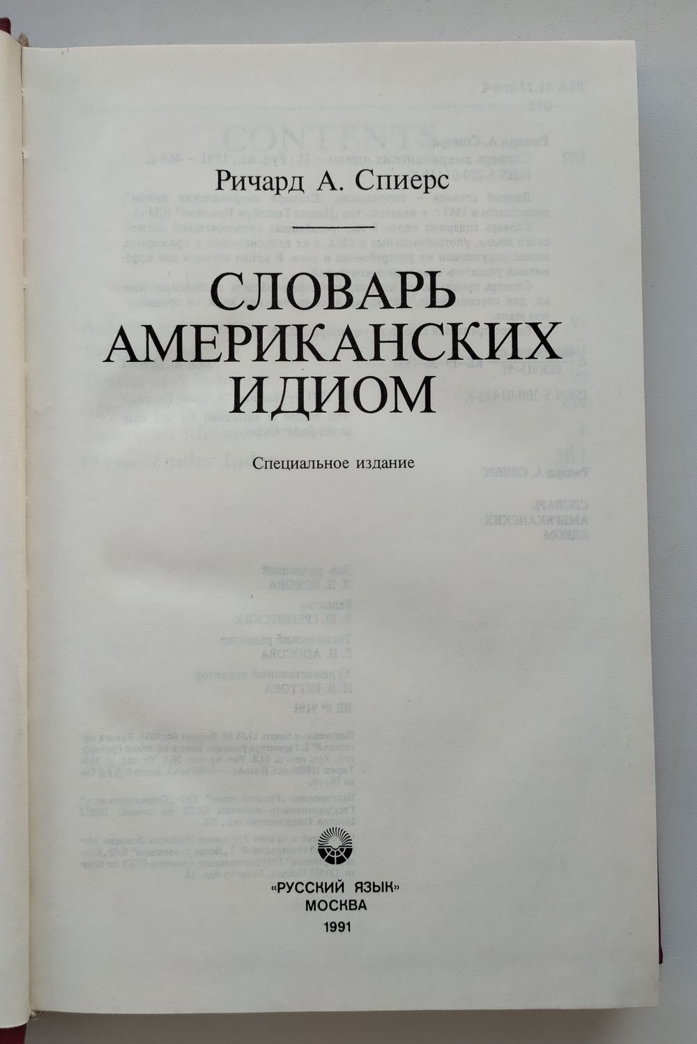 Спиерс Р.А. Словарь американских идиом. (American Idioms Dictionary). Специальное издание. Москва: Русский язык, 1991г., 464 с. Твёрдый переплёт, обычный формат. (ISBN: 5-200-01445-X / 520001445)