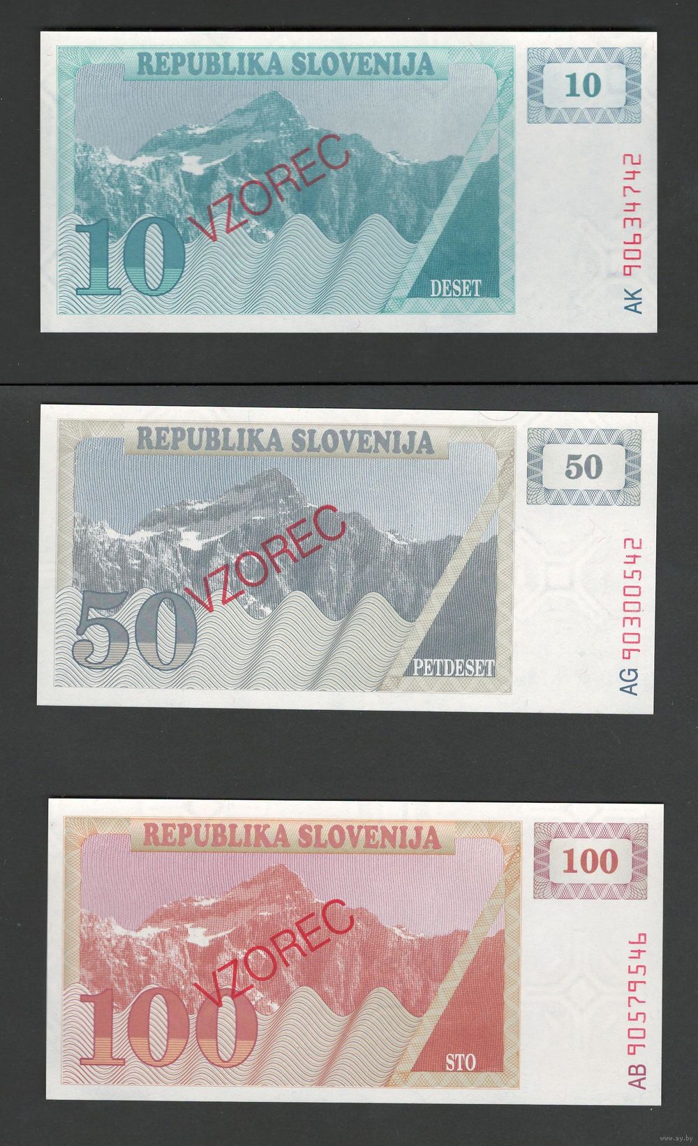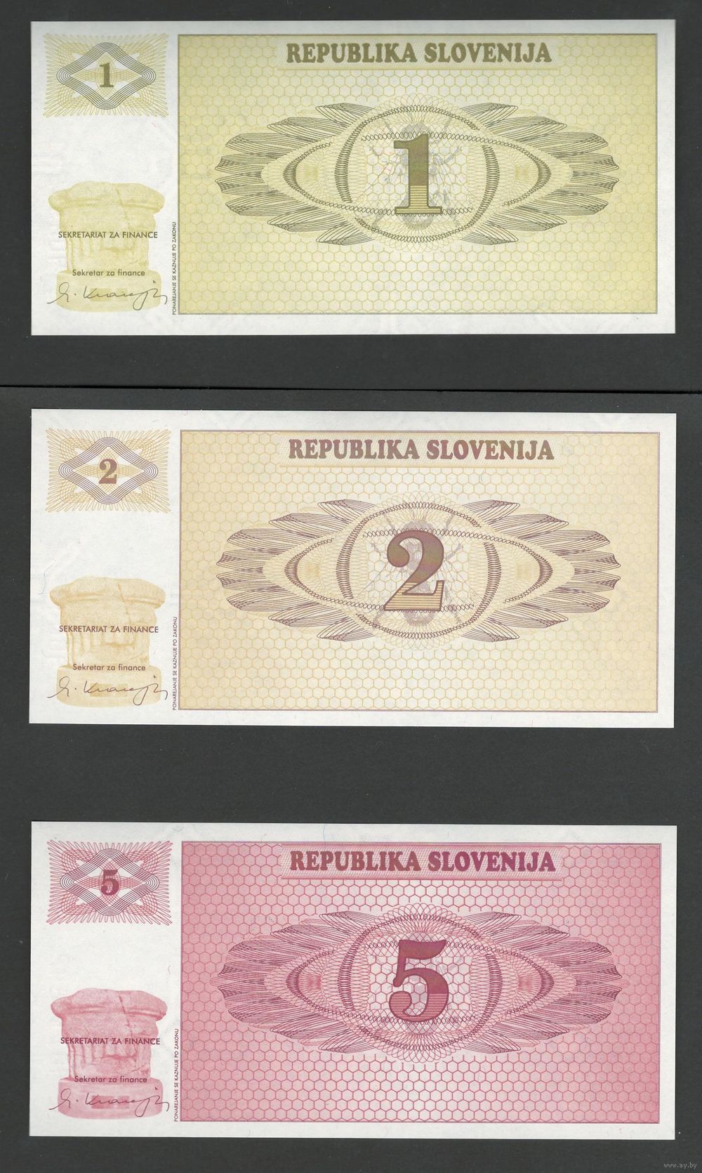 Словения набор банкнот от 1 до 100 толар 1990 года. Образцы. Типы Р-1,Р-2,Р-3,Р-4,Р-5,Р-6. Состояние UNC
