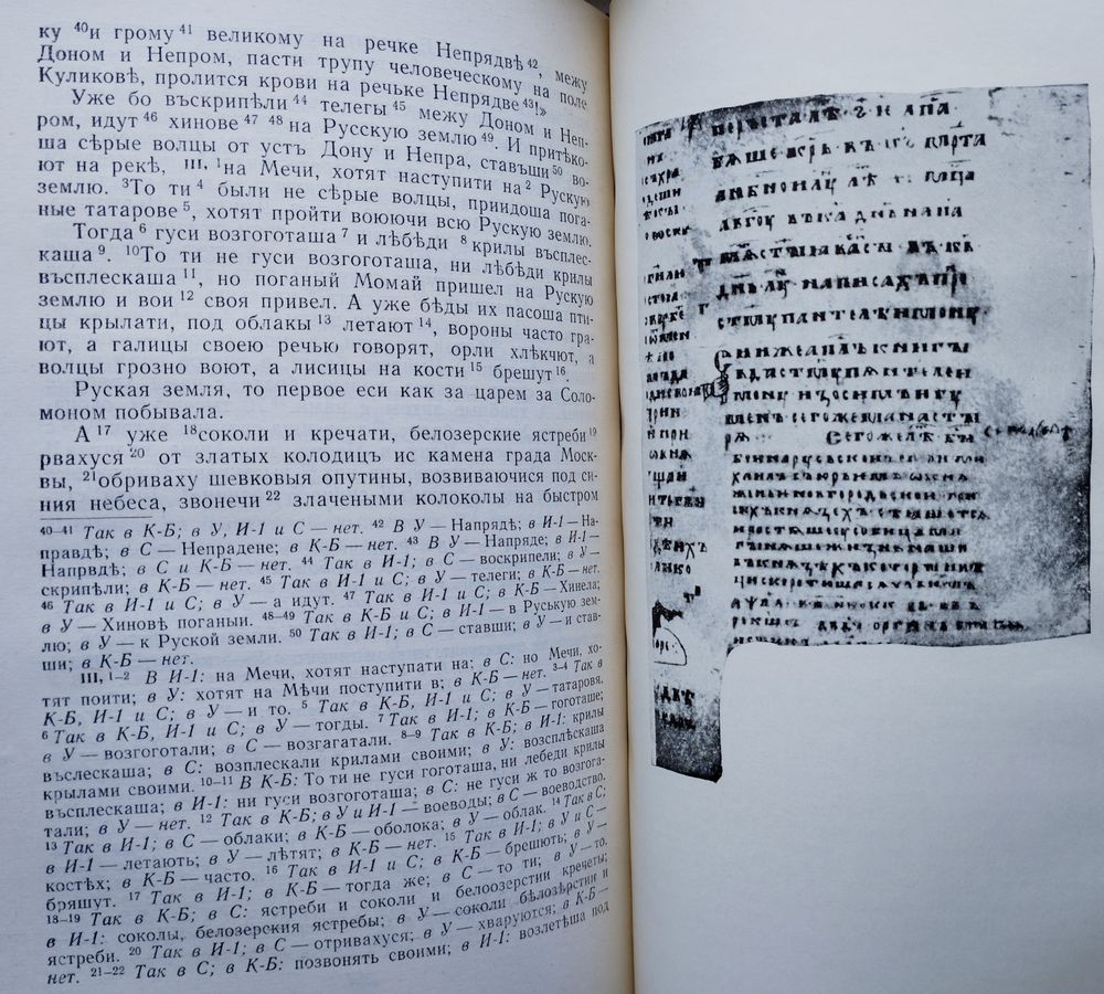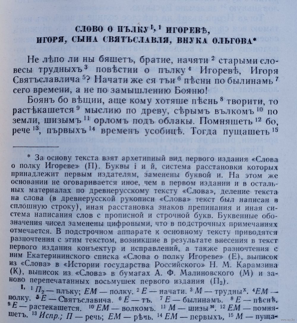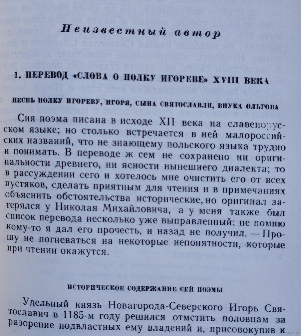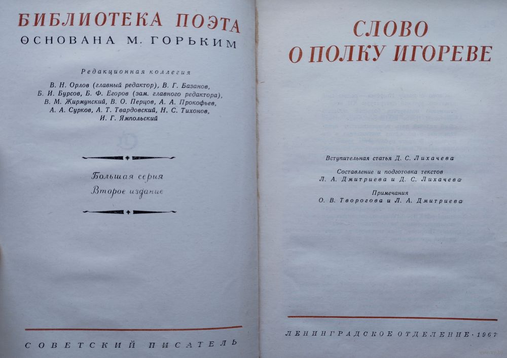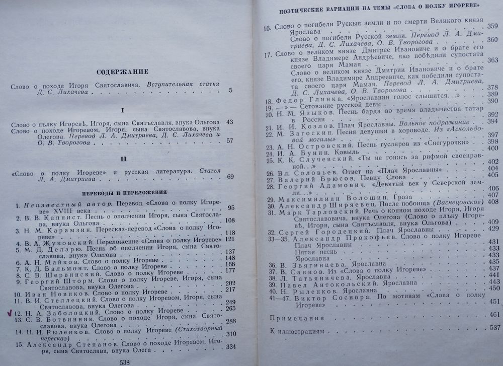 Тираж 25000 экз. 540 стр. Вступительные статьи Д. С. Лихачева и Л. А. Дмитриева. Составление Л. А. Дмитриева, Д. С. Лихачева Примечания О. В. Творогова. Реконструкция Древнерусского текста и комментарии Н. А. Мещерякова и А. А. Бурыкина. В книге три раздела. Состав первого: древнерусский текст, напечатанный в 1800 г. первыми издателями; перевод, которым сопровождалась эта публикация; реконструкция древнерусского текста и его перевод на современный русский язык. Во втором разделе три рубрики: 1) Стихотворные переводы и переложения «Слова о полку Игореве» XIX-XX вв. (кроме переводов на русский язык помещены переводы на украинский и белорусский языки). 2) Стихотворные переводы и переложения плача Ярославны русских и русских советских авторов. 3) Стихотворные произведения на темы «Слова о полку Игореве». Третий раздел – «Приложение» - содержит летописную повесть о походе князя Игоря, прозаический пересказ «Слова о полку Игореве» Н. М. Карамзина и статью А. С. Пушкина об этом произведении.