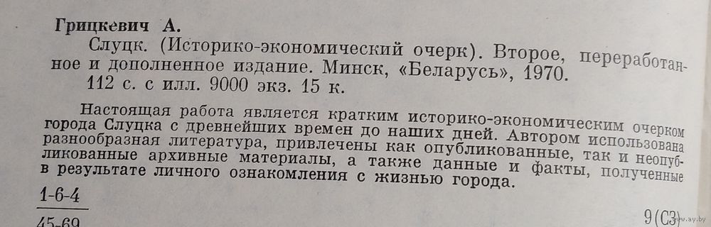 Слуцк: историко-экономический очерк. 2-е, переработанное и дополненное изд. Минск. Беларусь, 1970 г. 111 с. Мягкая обложка. Умен. формат.