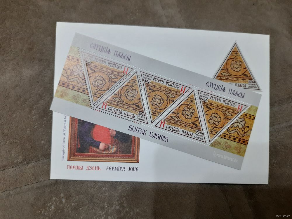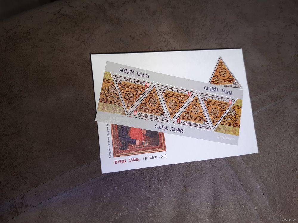 Художественная почтовая марка "Слуцкие пояса" изготовлена в виде равнобедренного треугольника. Марка выполнена с применением технологии термоподъёма, что придаёт ей 3D-эффект.