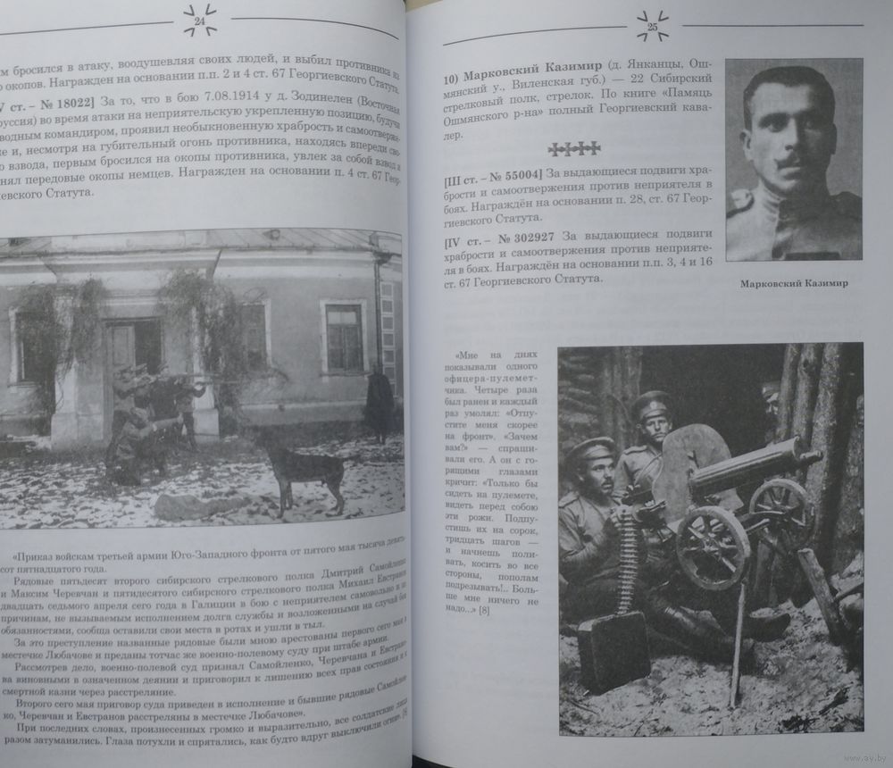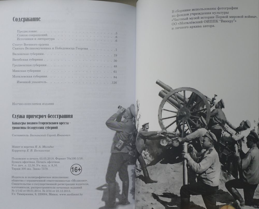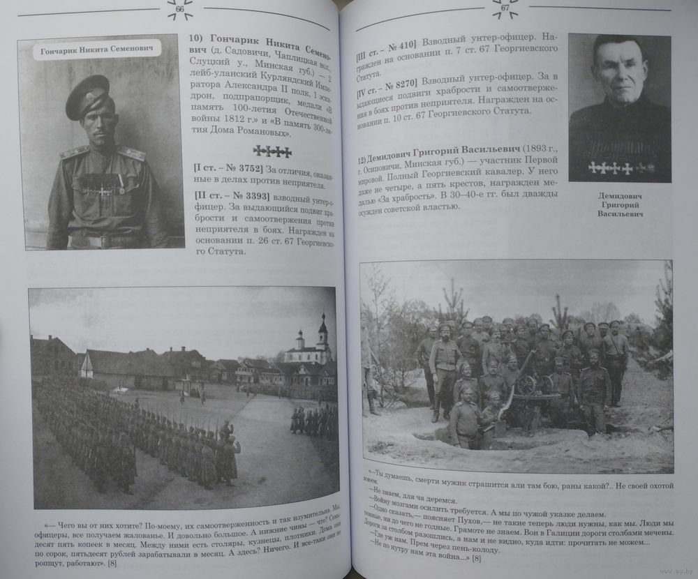 Большой энциклопедический формат. Тираж 300 экз. 128 стр. Книга включает в себя данные о полных Георгиевских кавалерах всех белорусских губерний, фотоиллюстрации, выдержки из воспоминаний офицеров Русской императорской армии-участников боевых действий: Войтоловского Льва Наумовича «Всходил кровавый Марс: по следам войны» и Попова Константина Сергеевича «Русская армия в Великой войне: воспоминания кавказского гренадера», передающих дух эпохи того времени. Этот первый сводный список белорусских Георгиевских кавалеров за прошедшее после войны столетие является только началом кропотливой работы по возвращению имён забытых героев. Среди награжденных солдатским Георгиевским крестом автору удалось отыскать имена около 400 уроженцев белорусских губерний бывшей Российской империи: Витебской, Виленской, Гродненской, Минской и Могилёвской. Среди них – «особо отличившиеся своей лихостью и дерзостью в боях»162 полных Георгиевских кавалера, которые помещены в книге. Сегодня их пока далеко неполный список по губерниям выглядит так: Виленская -16, Витебская-26, Гродненская-25, Минская-38, Могилёвская-56. Восемь из них имеют полный Георгиевский бант - четыре креста и четыре медали «За храбрость». Представители разных сословий, национальностей и вероисповедания проявили необычайные мужество, доблесть, отвагу на полях сражений и …на сто лет были забыты потомками. Память о них стала уделом родственников и нескольких энтузиастов-поисковиков, а должна бы стать общенациональной.