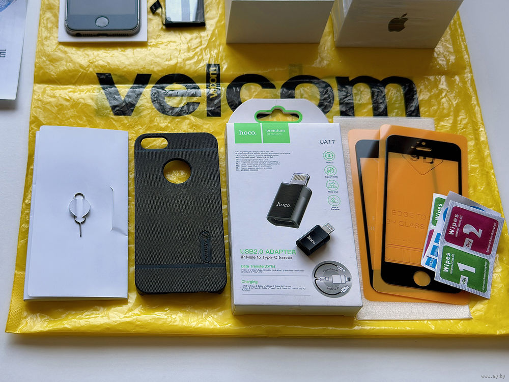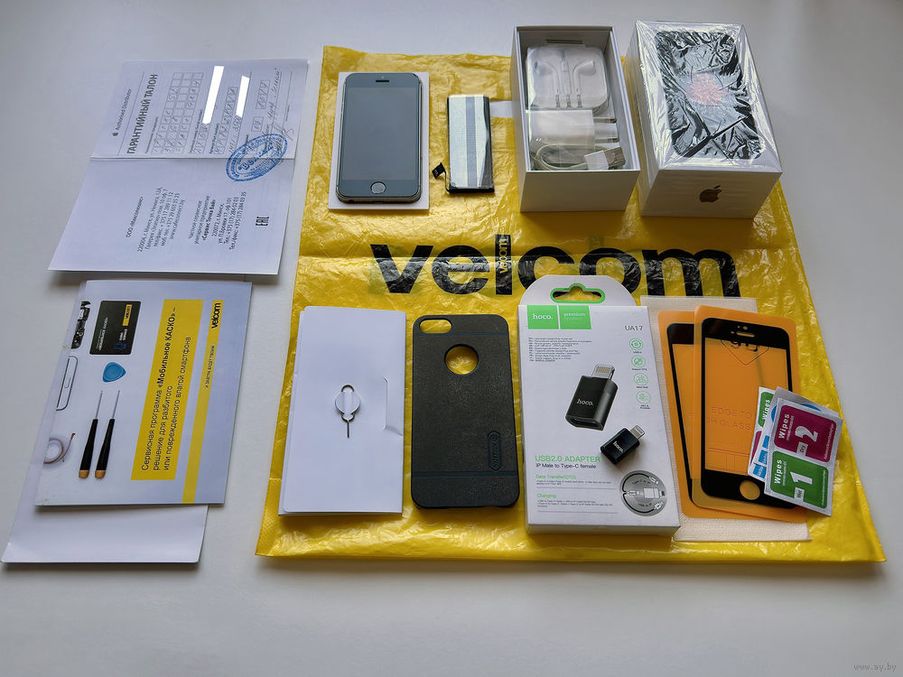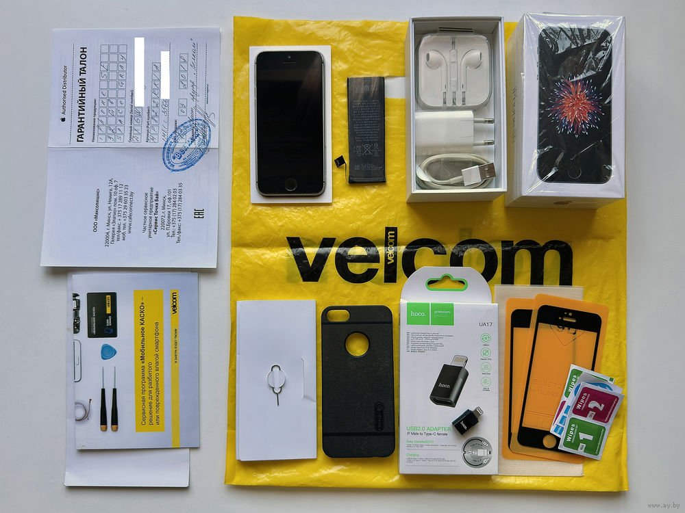 • Сохранён полный комплект, включая все оригинальные аксессуары из комплекта, т. е. лоток под sim-карту, зарядное устройство, кабель, наушники, документы, упаковку и подарочный пакет от организации Velcom/A1.