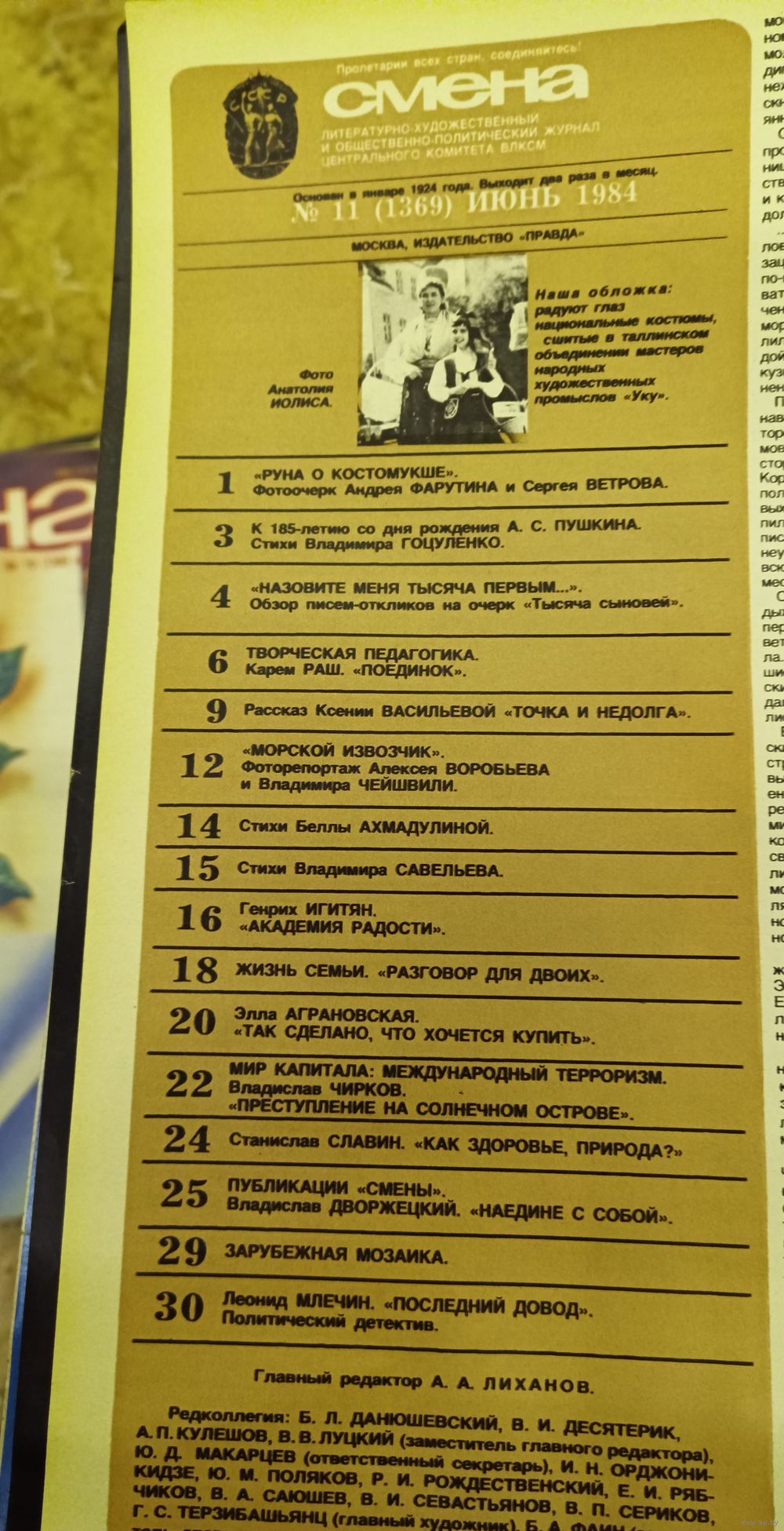 СМЕНА.Номер 11 , июнь 1984г..Литературно-художественный и общественно-политический журнал ЦК ВЛКСМ