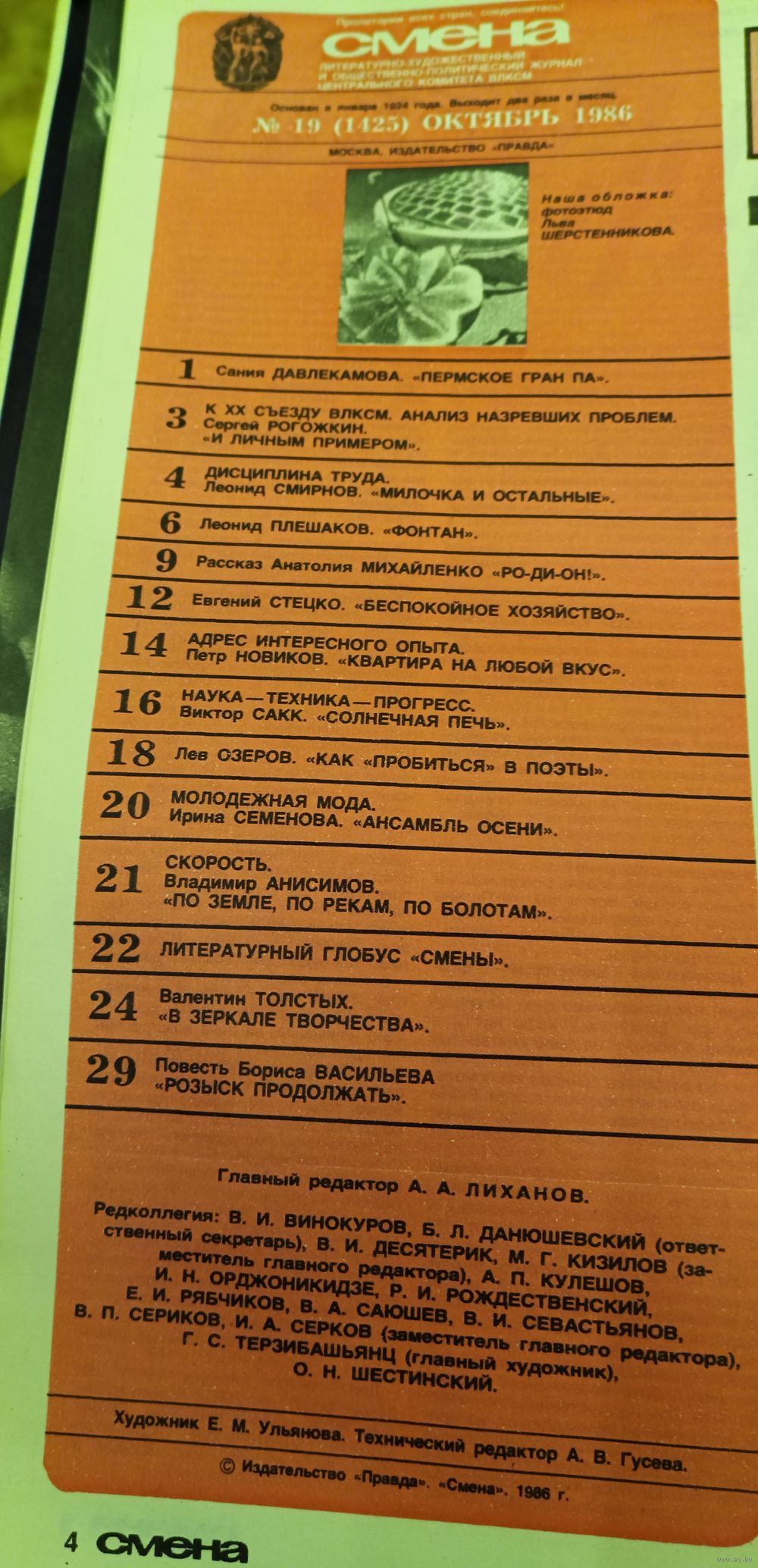 СМЕНА.Номер 19,октябрь 1986г..Литературно-художественный и общественно-политический журнал ЦК ВЛКСМ.