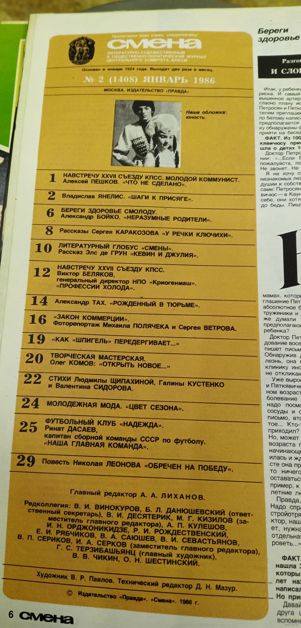 СМЕНА.Номер 2,январь 1986г..Литературно-художественный и общественно-политический журнал ЦК ВЛКСМ.