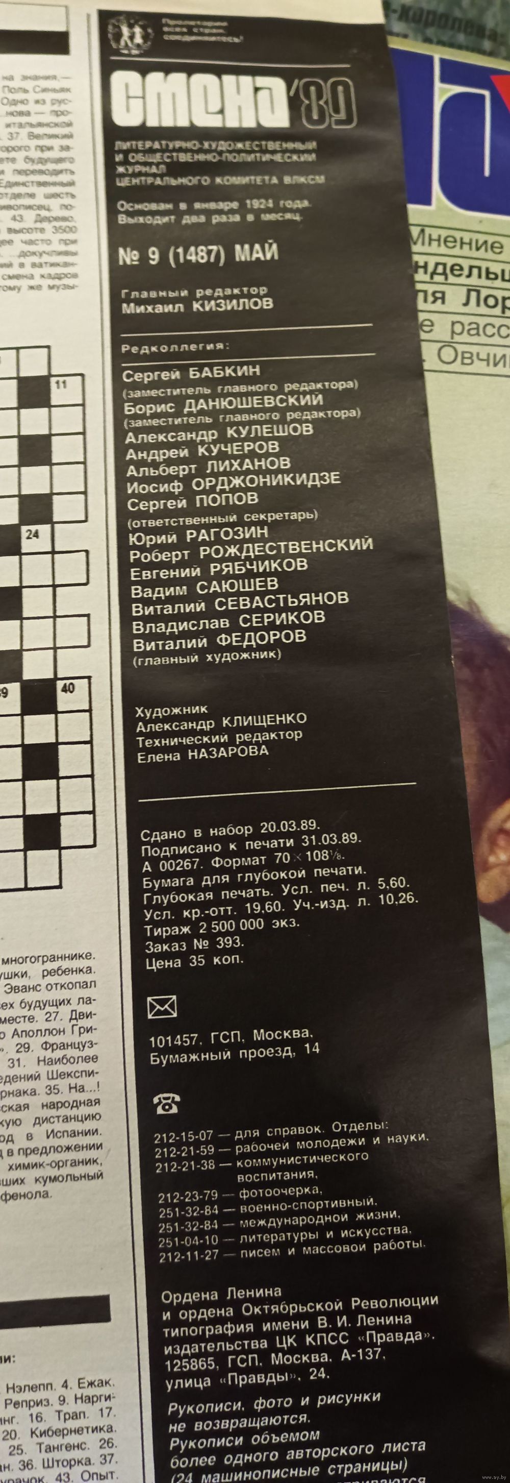 СМЕНА.Номер 9, май 1989г..Литературно-художественный и общественно-политический журнал ЦК ВЛКСМ.