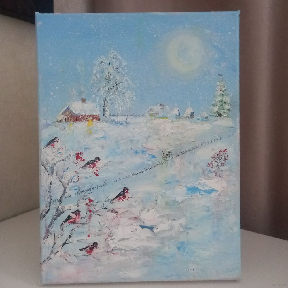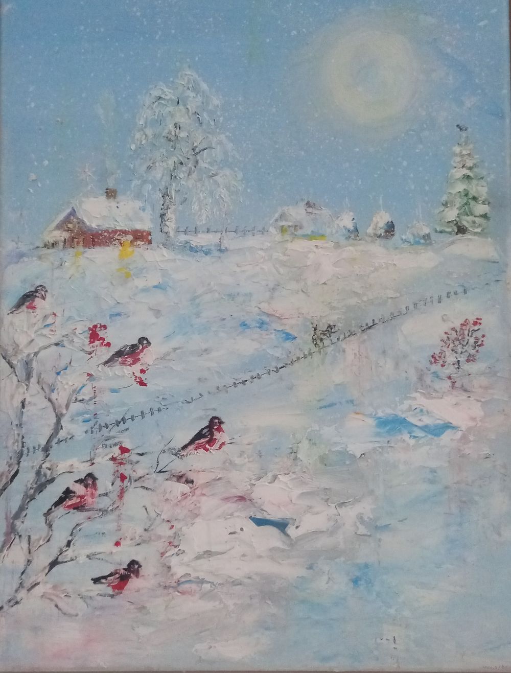 Снегири/18×24/масло/холст на подрамнике/мастихин, кисть/Демеш Т.М.