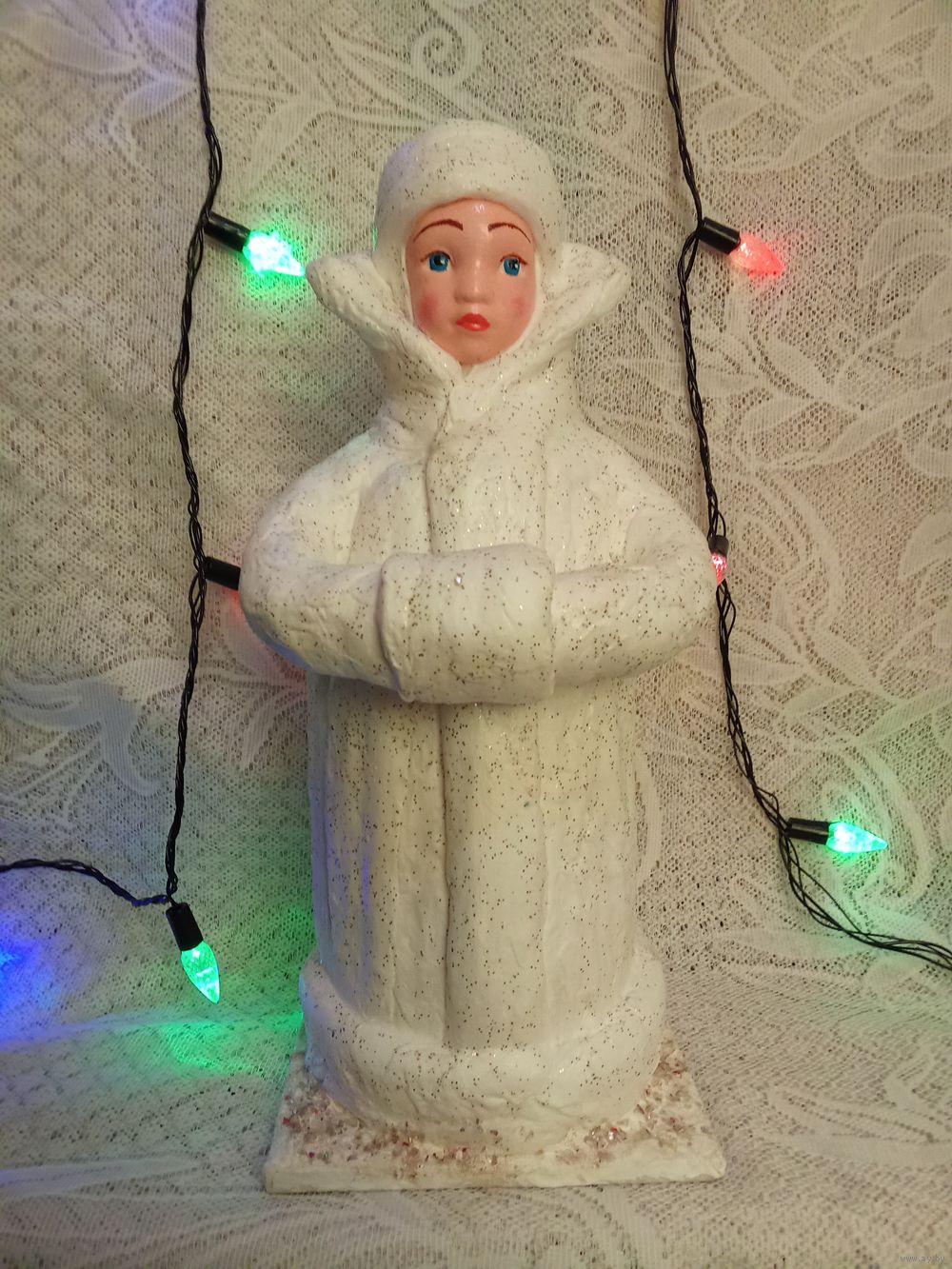 Снегурочка ватная 35 см. Вата, дерево, ткань, холодный фарфор. Ручная работа в стиле ретро. Состояние хорошее.
