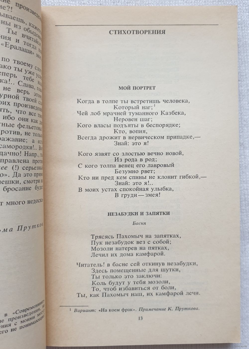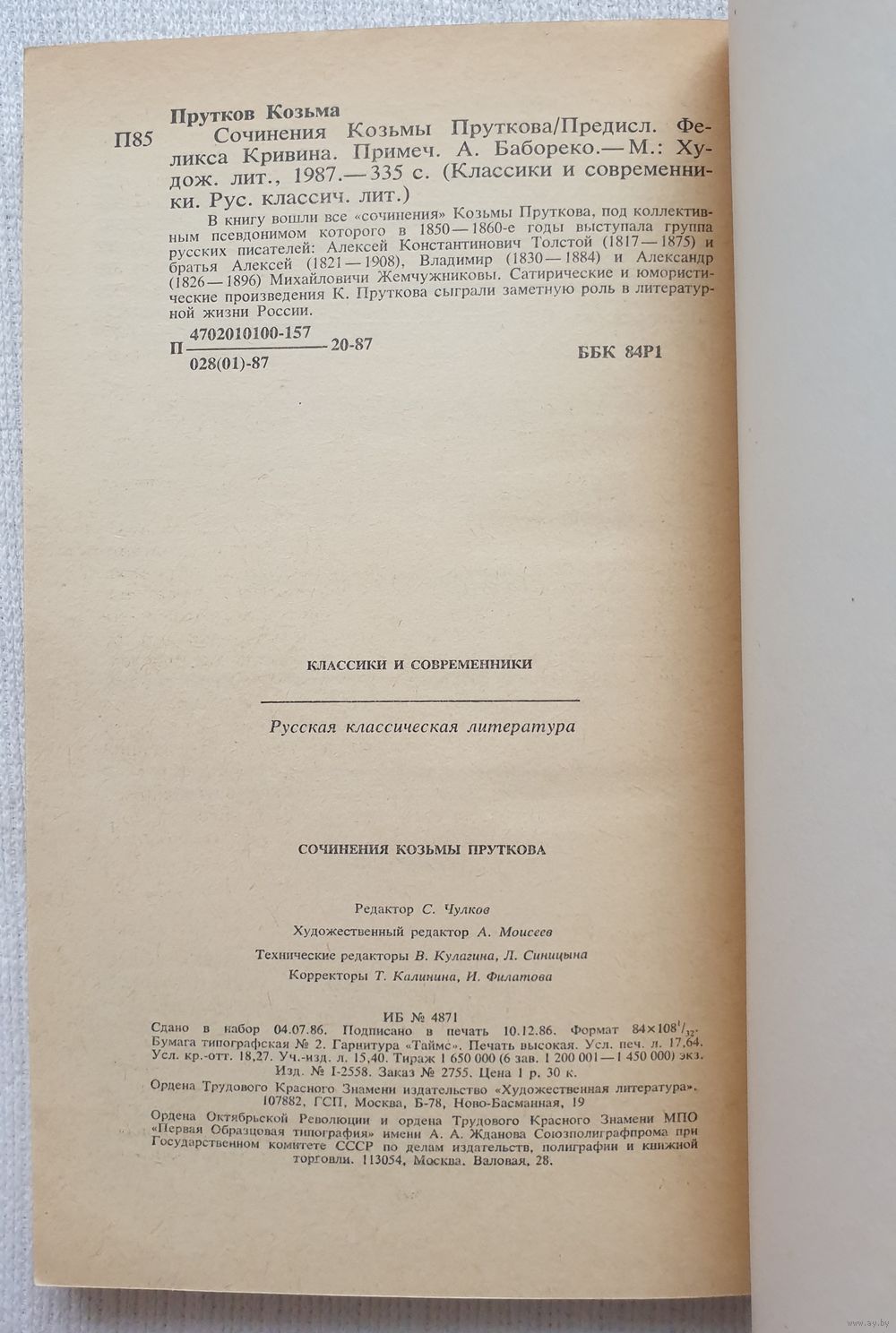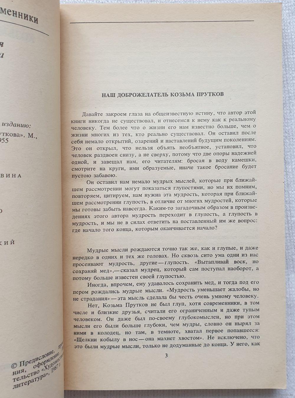 В книгу вошли все "сочинения" Козьмы Пруткова, под коллективным псевдонимом которого в 1850-1860-е годы выступала группа русских писателей: Алексей Константинович Толстой и братья Алексей, Владимир и Александр Михайловичи Жемчужниковы. Сатирические и юмористические произведения К.Пруткова сыграли заметную роль в литературной жизни России.