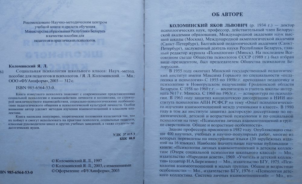 Большой формат. Тираж 5100 экз. 312 стр. Книга известного психолога знакомит с современными представлениями социальной психологии о взаимодействии личности и коллектива, со структурой межличностного взаимодействия, социально-психологическими особенностями педагогического общения и психологической культурой личности. Особое внимание автор уделяет методам изучения взаимоотношений в классном коллективе. Книга написана популярно, теоретические положения излагаются так, что их поймут и смогут использовать на практике психологи, социальные педагоги, классные руководители школ и других учебных заведений, а также студенты педагогических вузов.