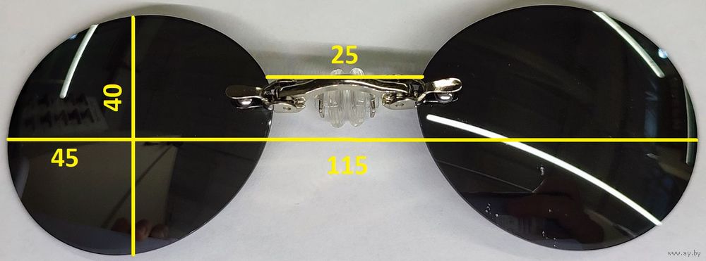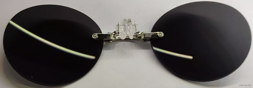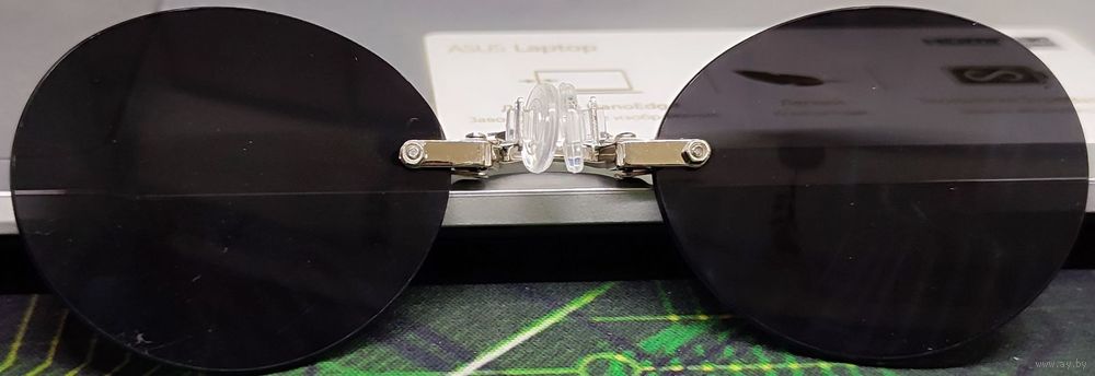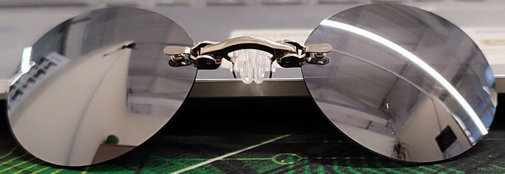 Зеркальные солнечные очки-пенсне без дужек для ушей. Стильные, универсальные, подходят для любого пола и возраста, для любой формы лица. Держатся исключительно на переносице за счёт зажимов с силиконовыми накладками. Жёсткого дискомфорта при носке не доставляют. Есть пару мелких некритичных царапин на одной из линз (фото №8). Размеры на фото №2. Линзы пластиковые антибликовые. Не исключены и варианты падения при: