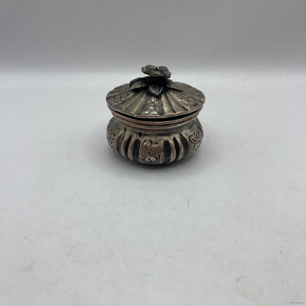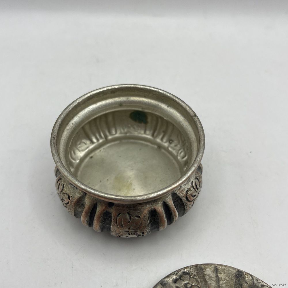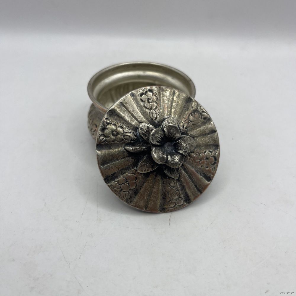 Антикварная солонка ручной работы, выполнена из посеребренной меди. Декорирована растительным узором ручной гравировки, ручка в виде объемного миниатюрного цветка с листьями. Лужение внутри. Франция. 1930-е г.г. Диаметр 6 см, высота 4,5 см. Естественная патина, частичный сход серебрения.