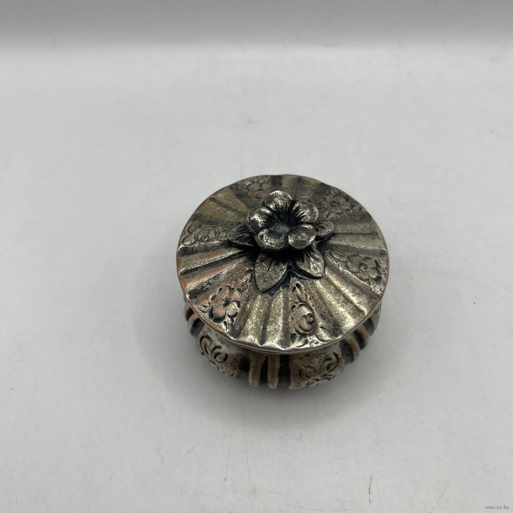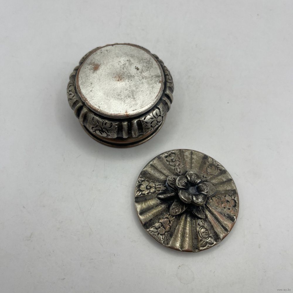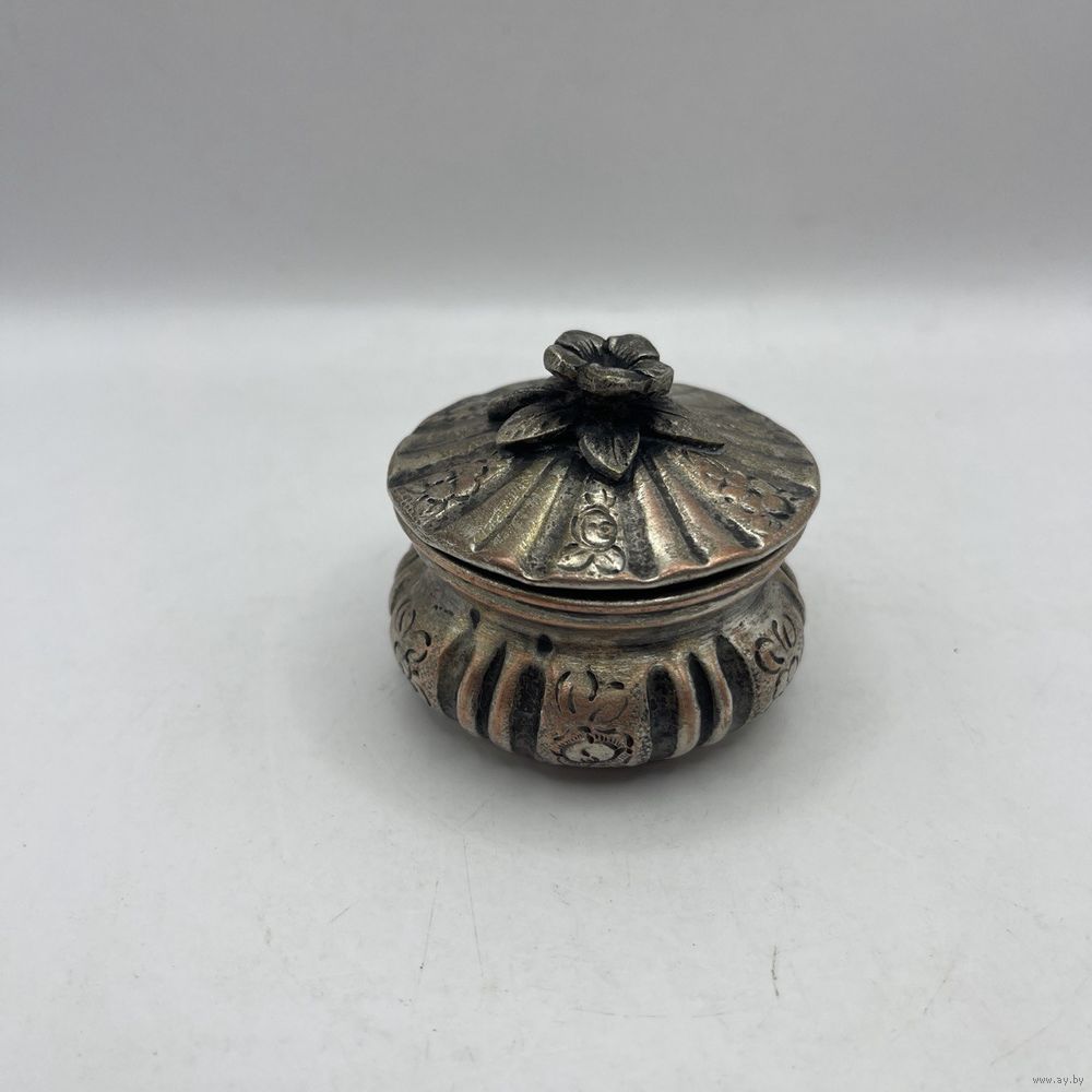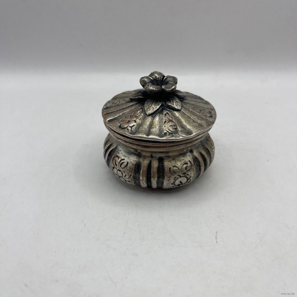 Антикварная солонка ручной работы, выполнена из посеребренной меди. Декорирована растительным узором ручной гравировки, ручка в виде объемного миниатюрного цветка с листьями. Лужение внутри. Франция. 1930-е г.г. Диаметр 6 см, высота 4,5 см. Естественная патина, частичный сход серебрения.