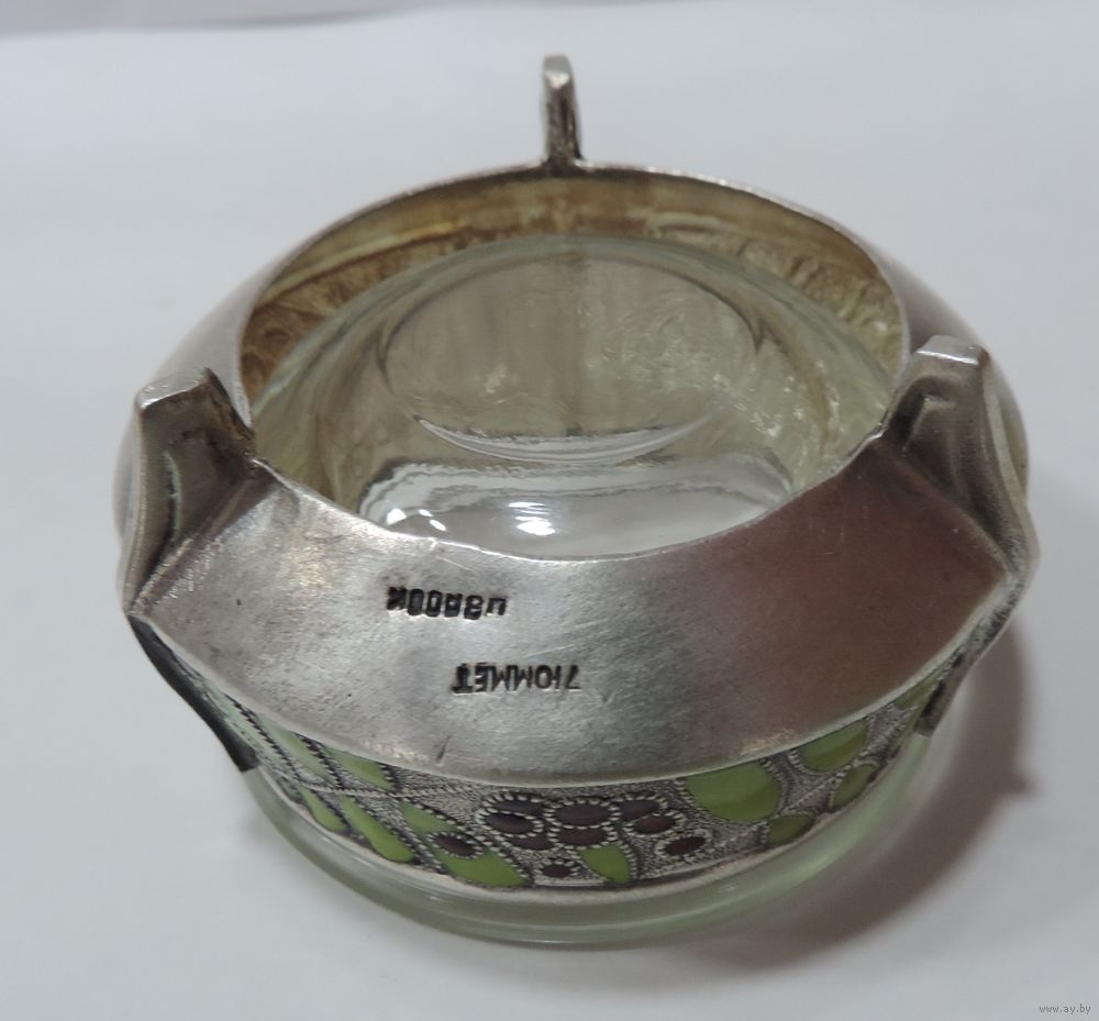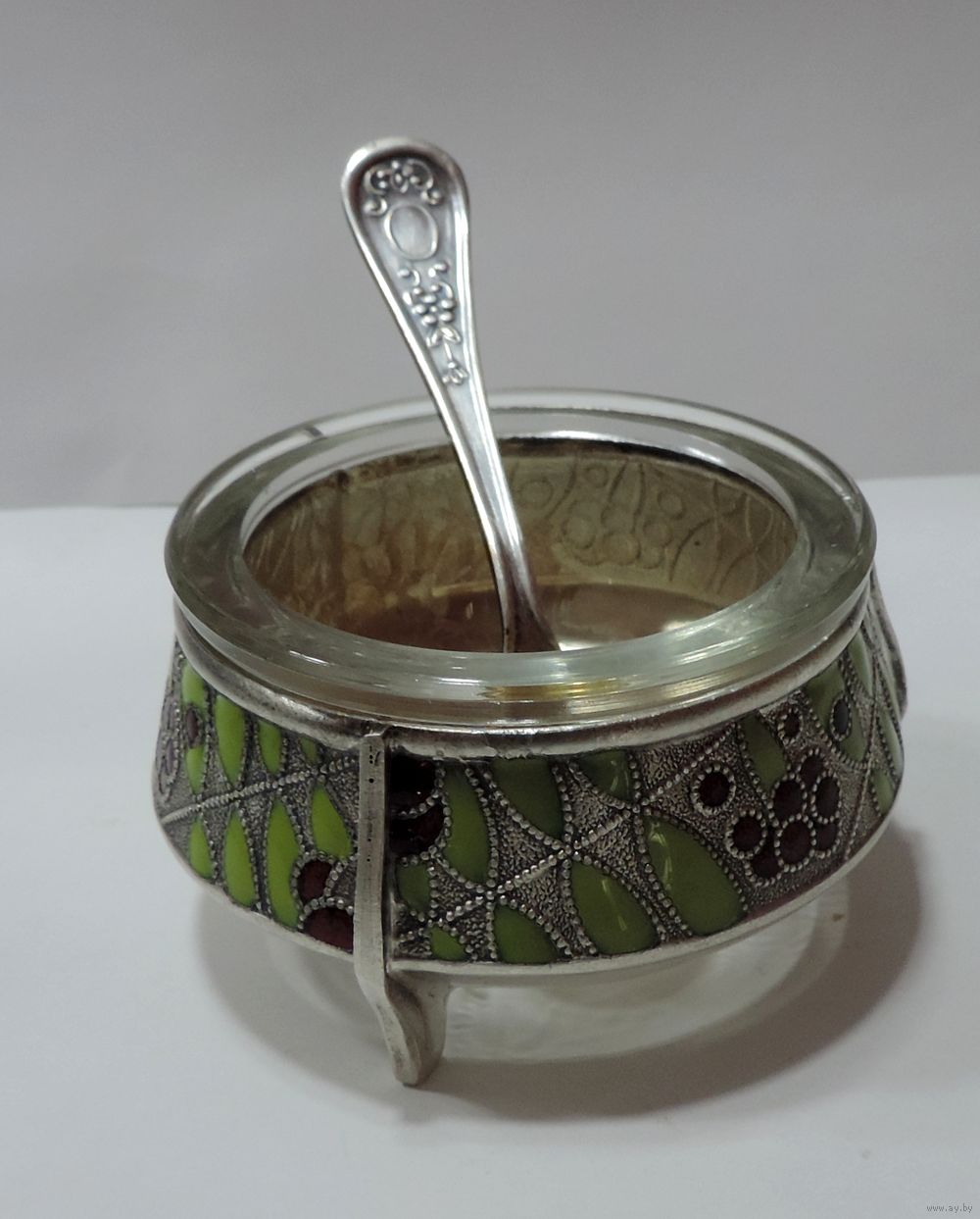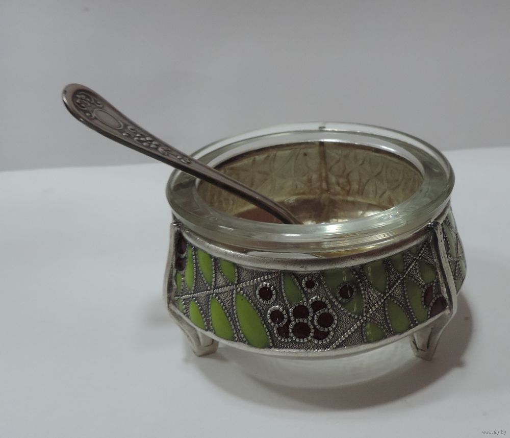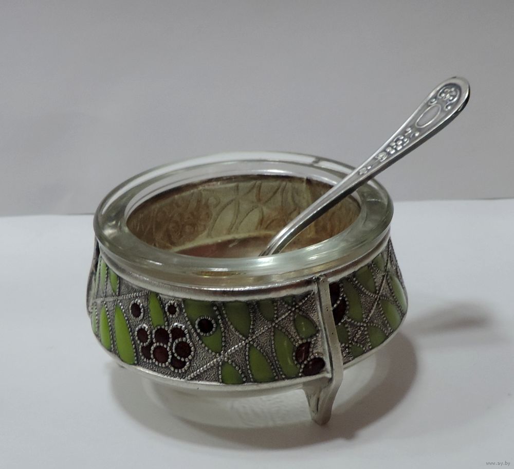 Солонка с ложкой 60-70-е годы СССР. Мельхиор, эмаль, посеребренная. Эмаль целая.