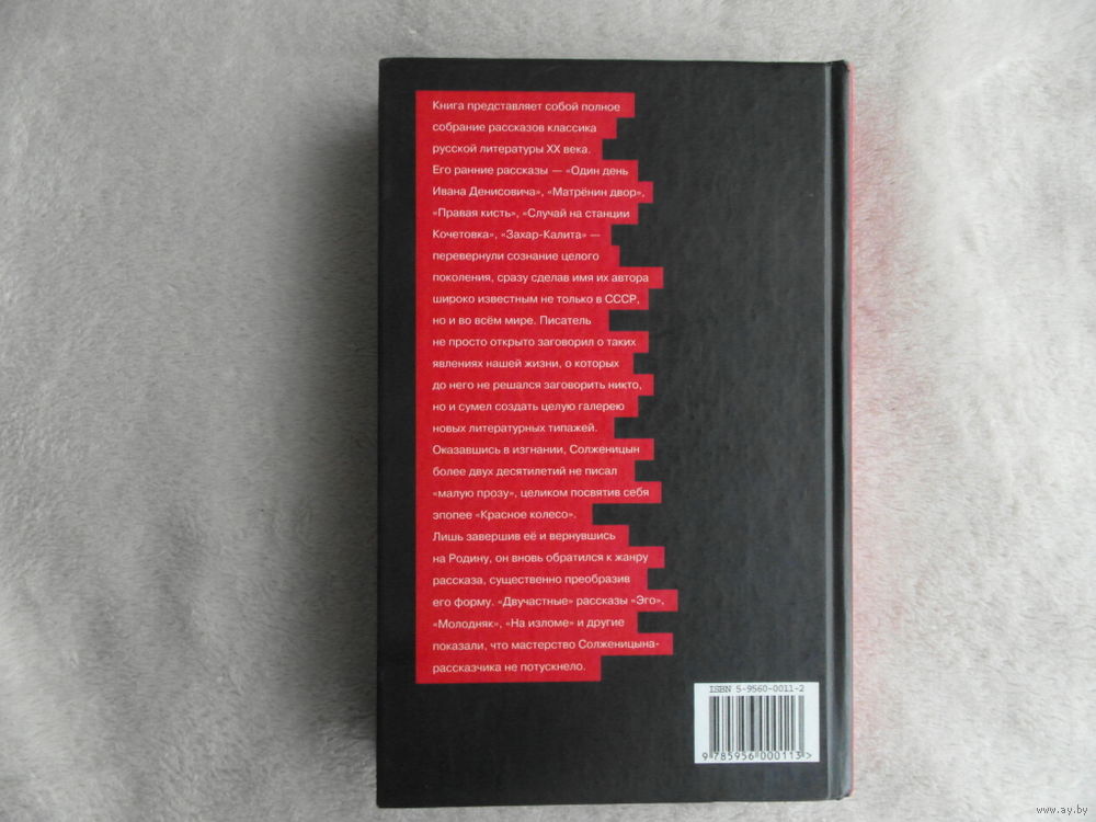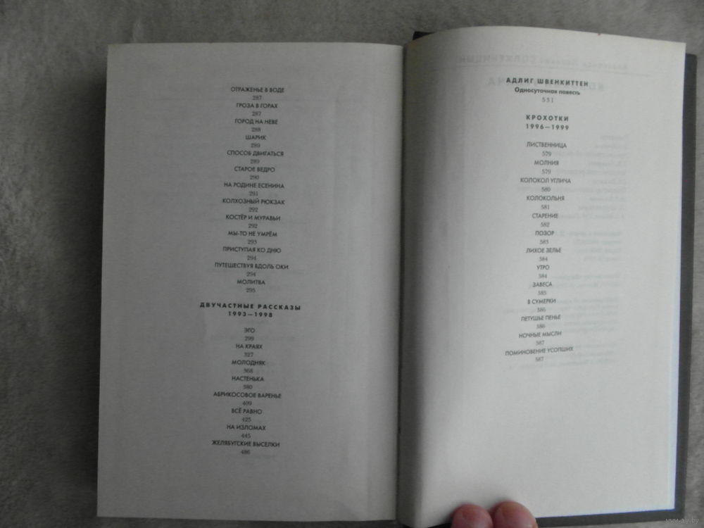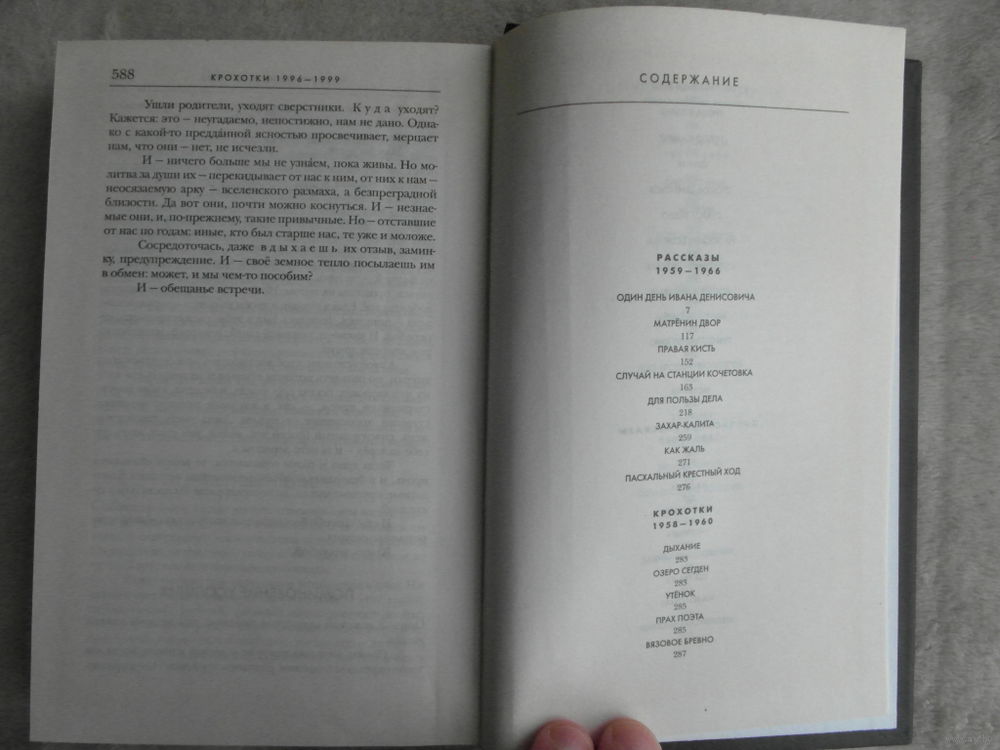 Рассказы 1959-1966 гг.: Один день Ивана Денисовича. Матренин двор. Правая кисть. Случай на станции Кочетовка. Для пользы дела. Как жаль. Пасхальный крестный ход. Крохотки 1958-1960 гг.: Дыхание. Озеро Сегден. Утенок. Прах поэта. Вязовое бревно. Отражение в воде. Гроза в горах. Город на Неве. Шарик. Способ двигаться. Старое ведро. На родине Есенина. Колхозный рюкзак. Костер и муравьи. Мы то не умрем. Приступая ко дню. Путешествуя вдоль Оки. Молитва. Двучастные рассказы 1993-1998 гг.: Эго. На краях. Молодняк. Настенька. Абрикосовое варенье. Все равно. На изломах. Желябугские выселки. Адлиг Швенкиттен (односуточная повесть). Крохотки 1996-1999 гг.: Лиственница. Молния. Колокол Углича. Колокольня. Старение. Позор. Лихое зелье. Утро. Завеса. В сумерки. Петушье пенье. Ночные мысли. Поминовенье усопших