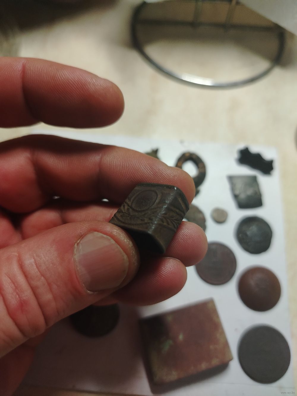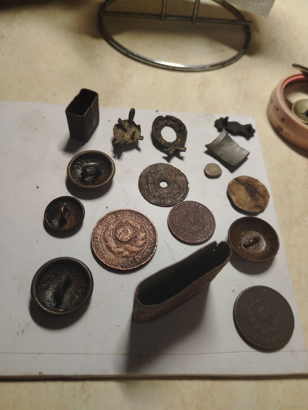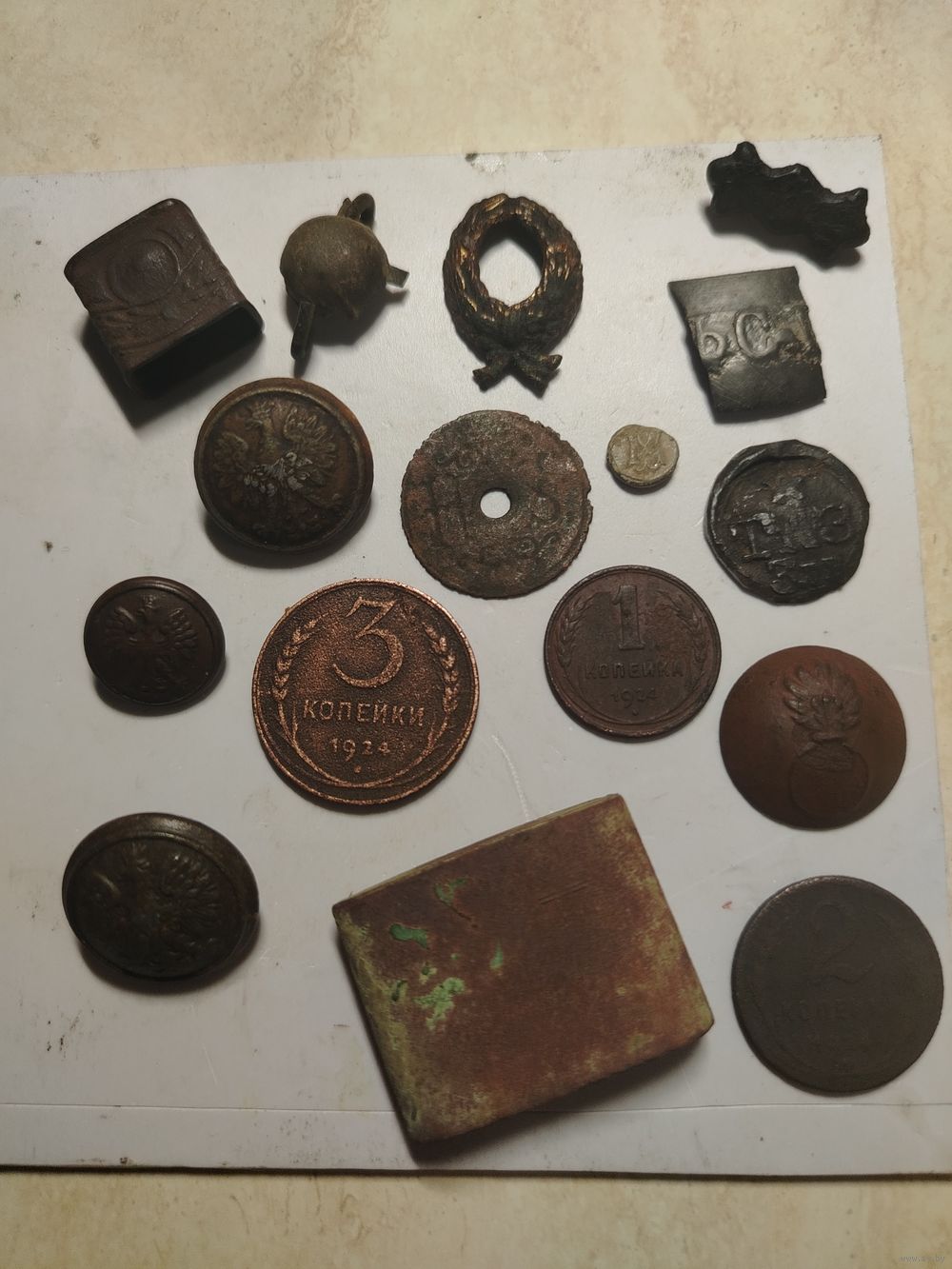 Часть кокарда, элементы с узорами, пломба, пуговицы, элемент от зажигалки, и прочее.