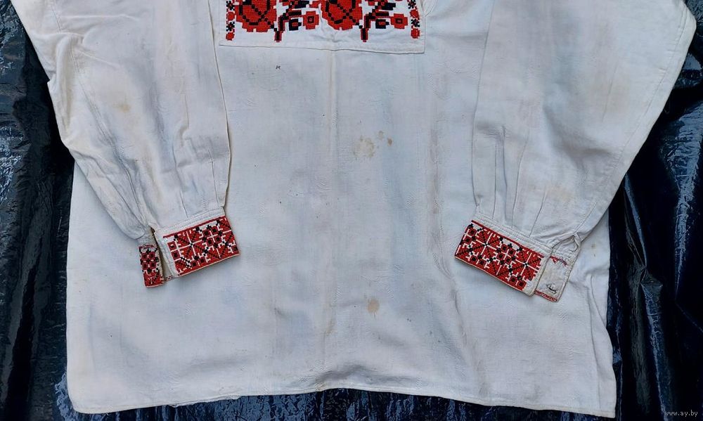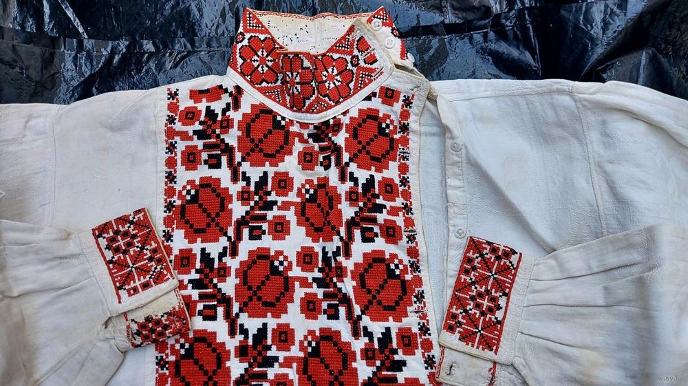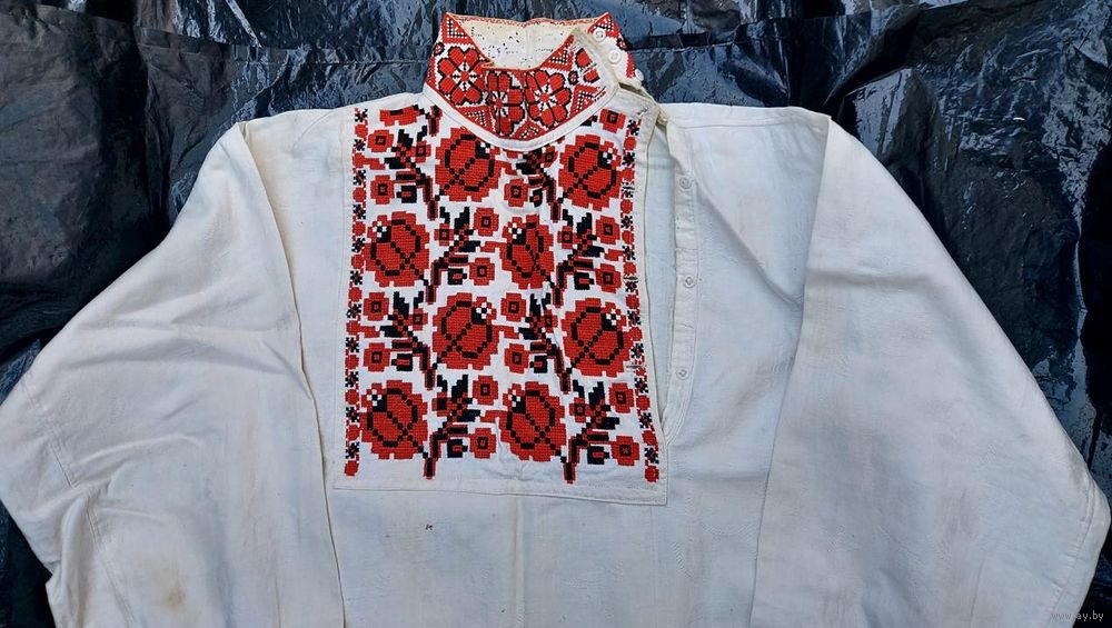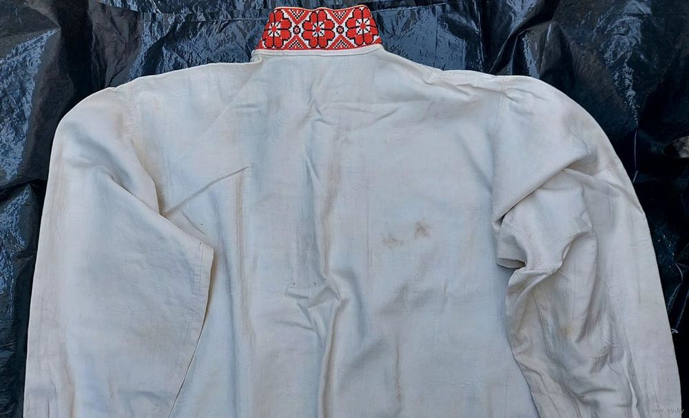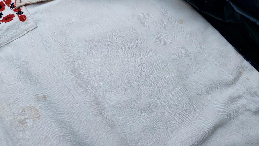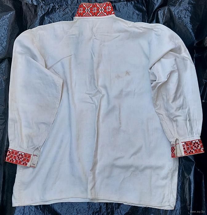 Традиционная белорусская сорочка, пошита в конце 1920-х годов. Ткань фабричная с растительным орнаментом, очень большая вышивка на груди – около 23 на 28 см. Реальный цвет вышивки ближе к красно-бордовому цвету. Сорочка в хорошем состоянии, есть пятнышки и следы от пятнышек на животе, лопатках, рукавах (на фото). Пятнышки не критичные, после стирок должно уйти.