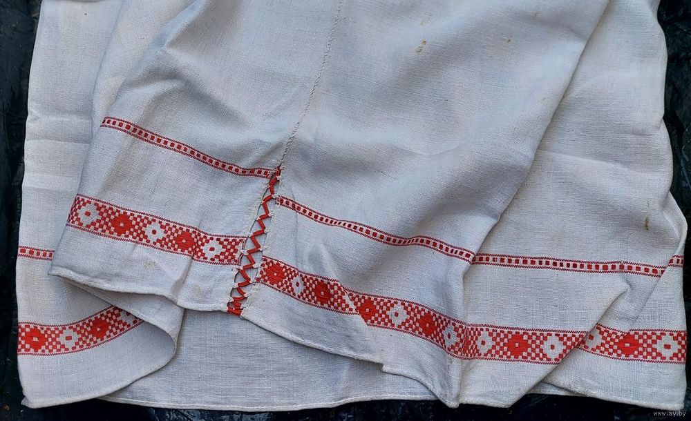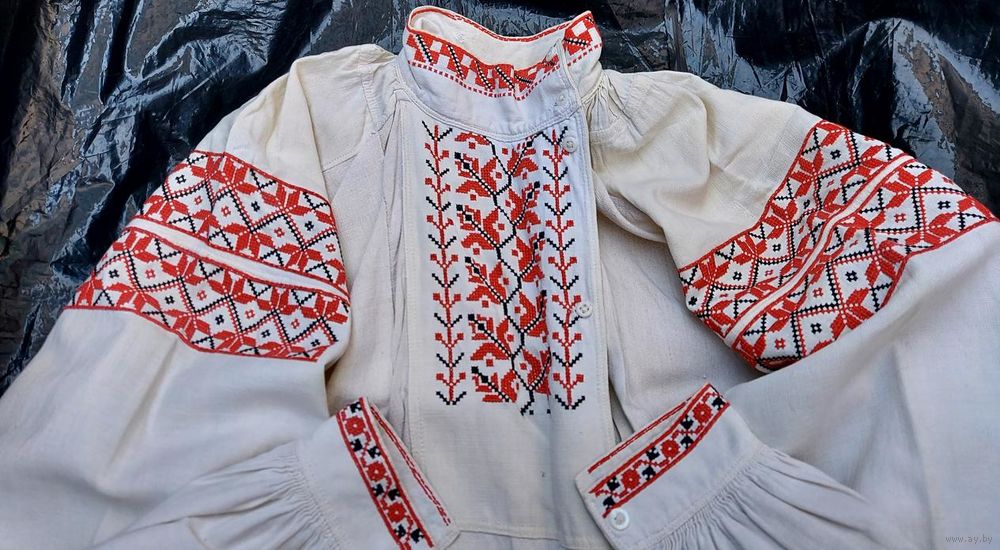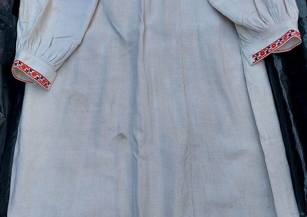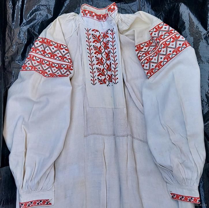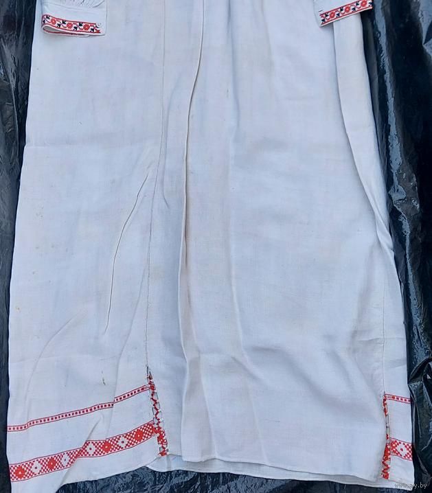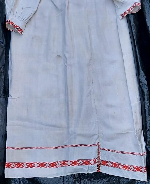Традиционная белорусская домотканая сорочка, пошита в 1900-е годы. Хорошее состояние, большой раздмер. Сзади ниже пояса несколько пятнышек (на фото), там же на боку несколько маленьких светло-желтых пятнышек (на фото). На левом плече зашита маленькая дырочка (едва заметно, на фото).