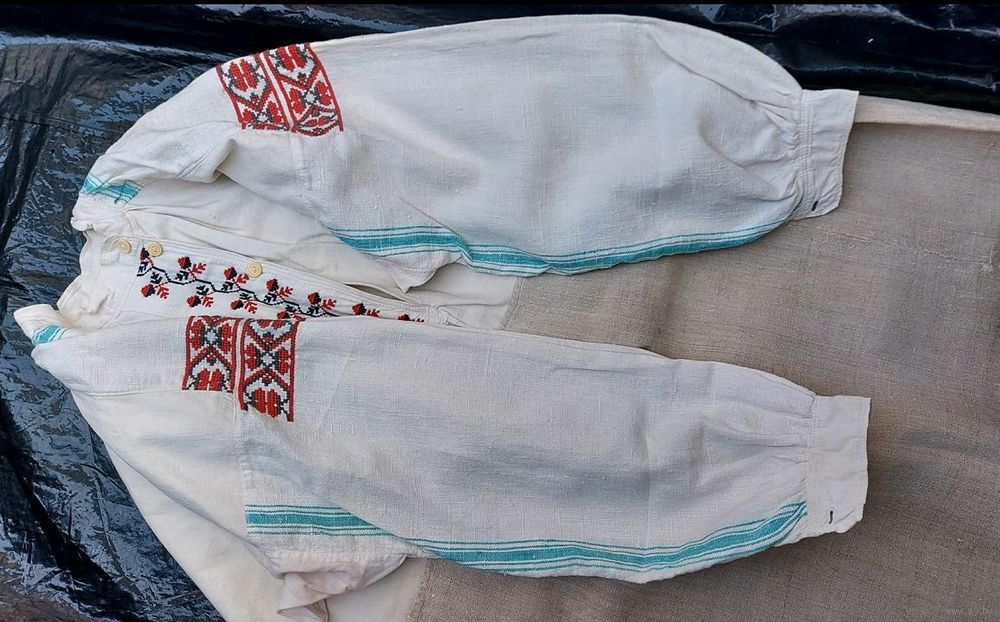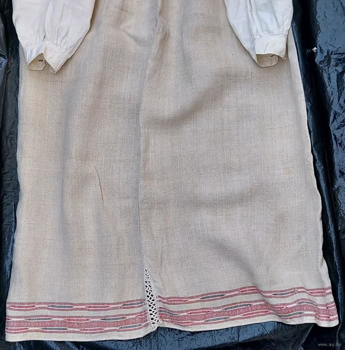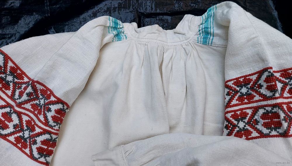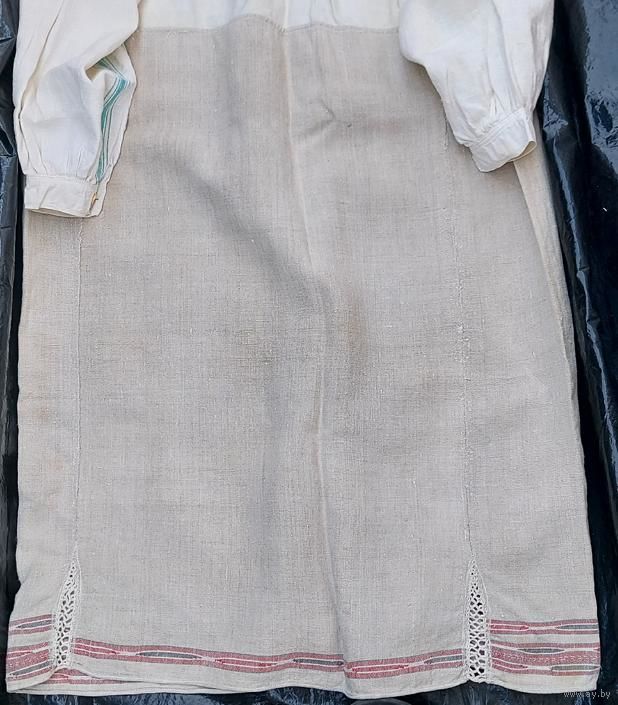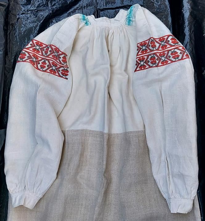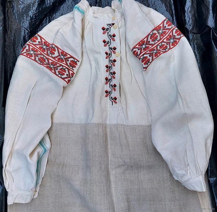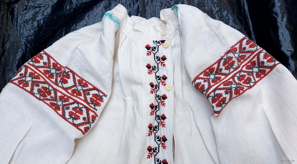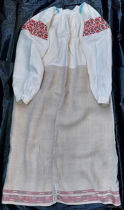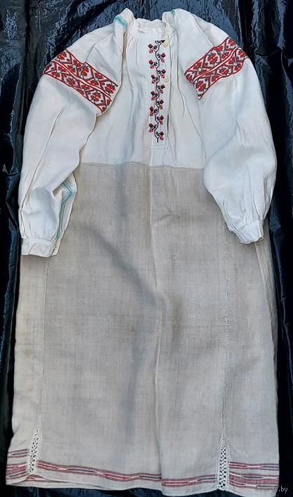 Традиционная белорусская сорочка, пошита до 1928 г. Очень хорошее состояние, под мышками едва заметные бледно красные следы от носки сорочки с красным кабатом (гарсетом).