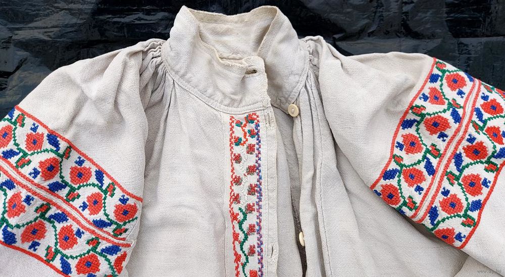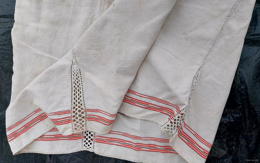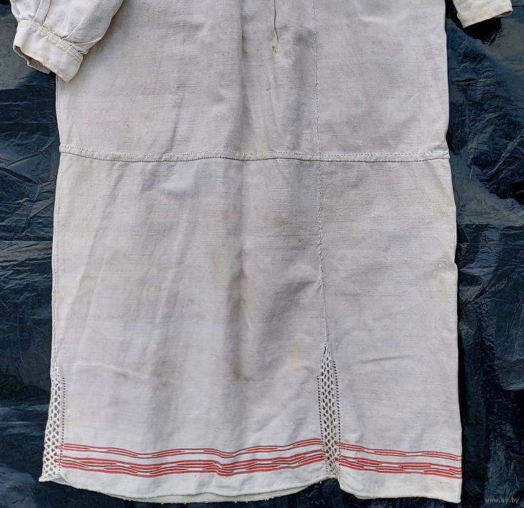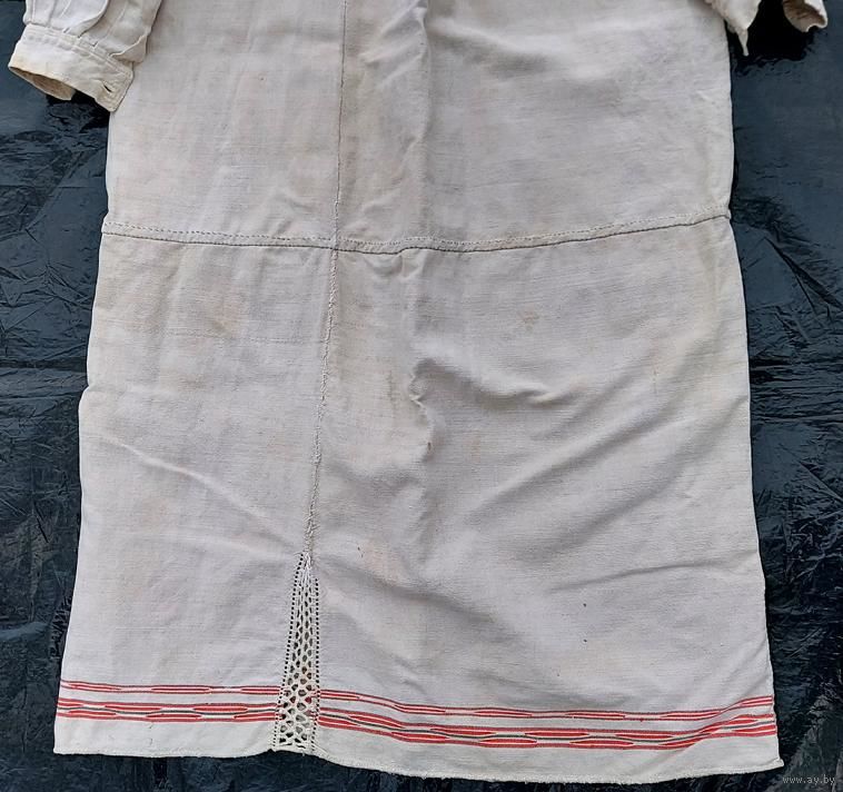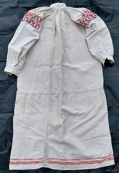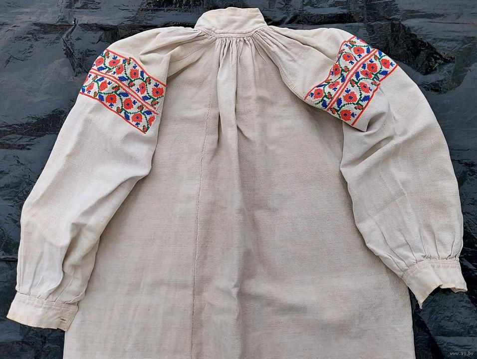 Традиционная белорусская домотканая сорочка, пошита в конце 1930-х. Хорошее состояние, несколько едва-едва заметных пятнышек на лопатке и у края нижней части(на фото). Чуть ниже левого локтя едва заметное пятнышко бледно-желтого оттенка со спичечный коробок. Сорочка пошита как поясянка из двух половин, шов идет ниже пояса.
