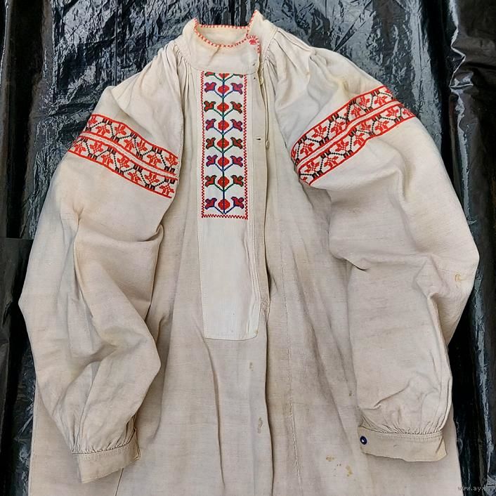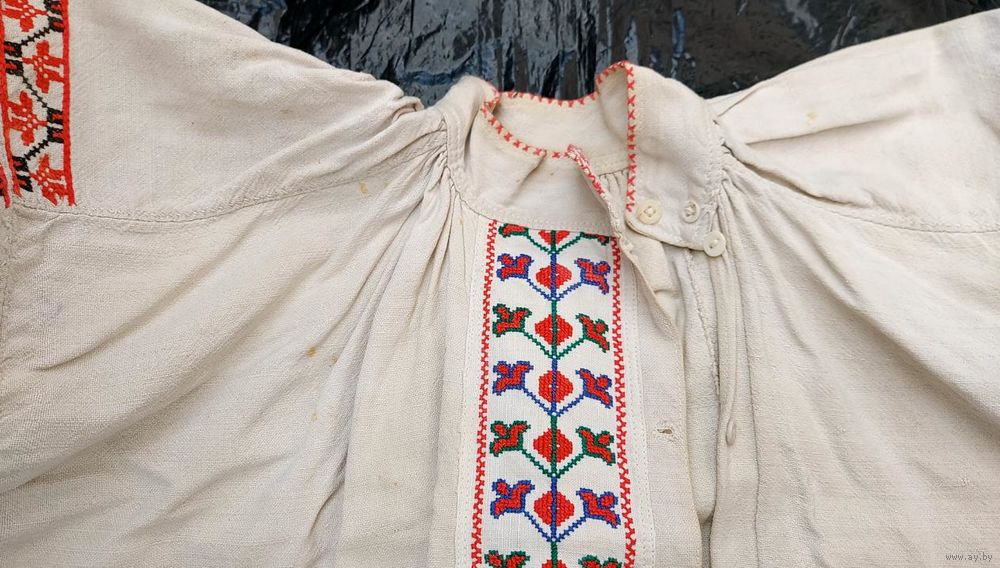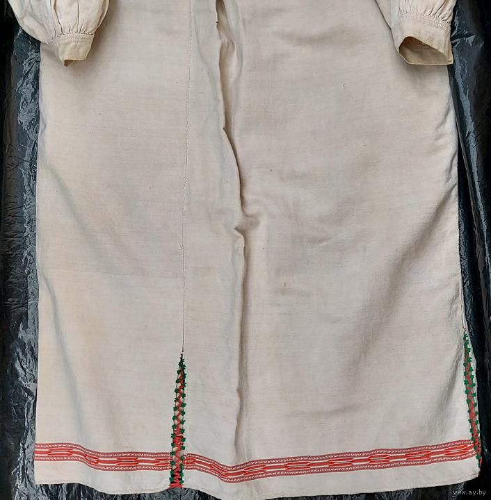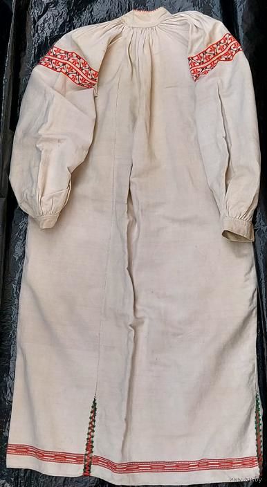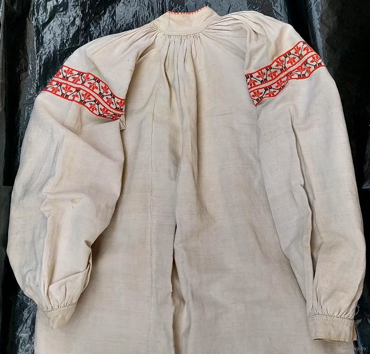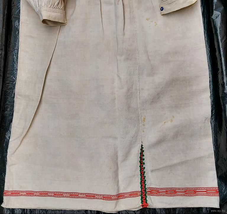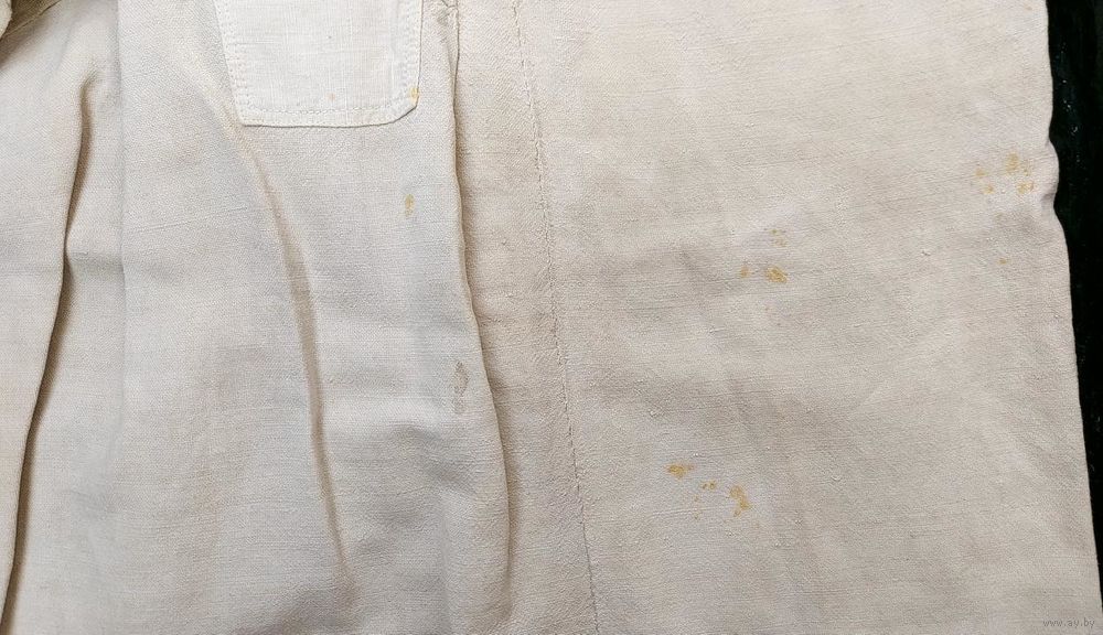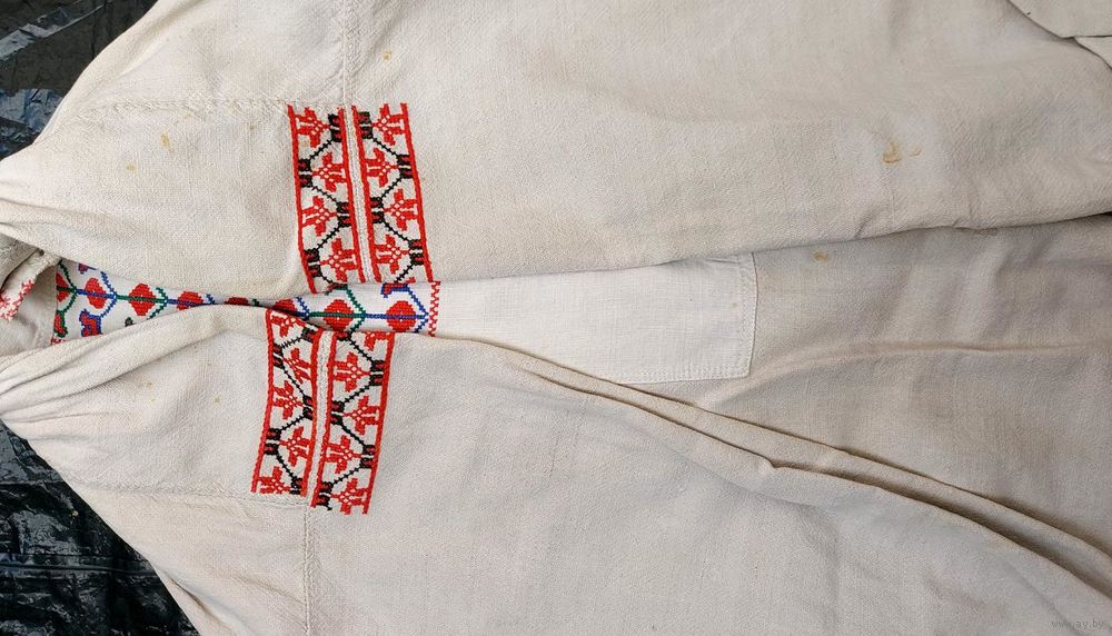 Традиционная белорусская домотканая сорочка, пошита в конце 1930-х. Хорошее состояние, но есть маленькие пятнышки бледно-желтого оттенка (на фото): на плечах, левом локте, правой груди, ниже пояса на левом боку и у нижнего края слева.